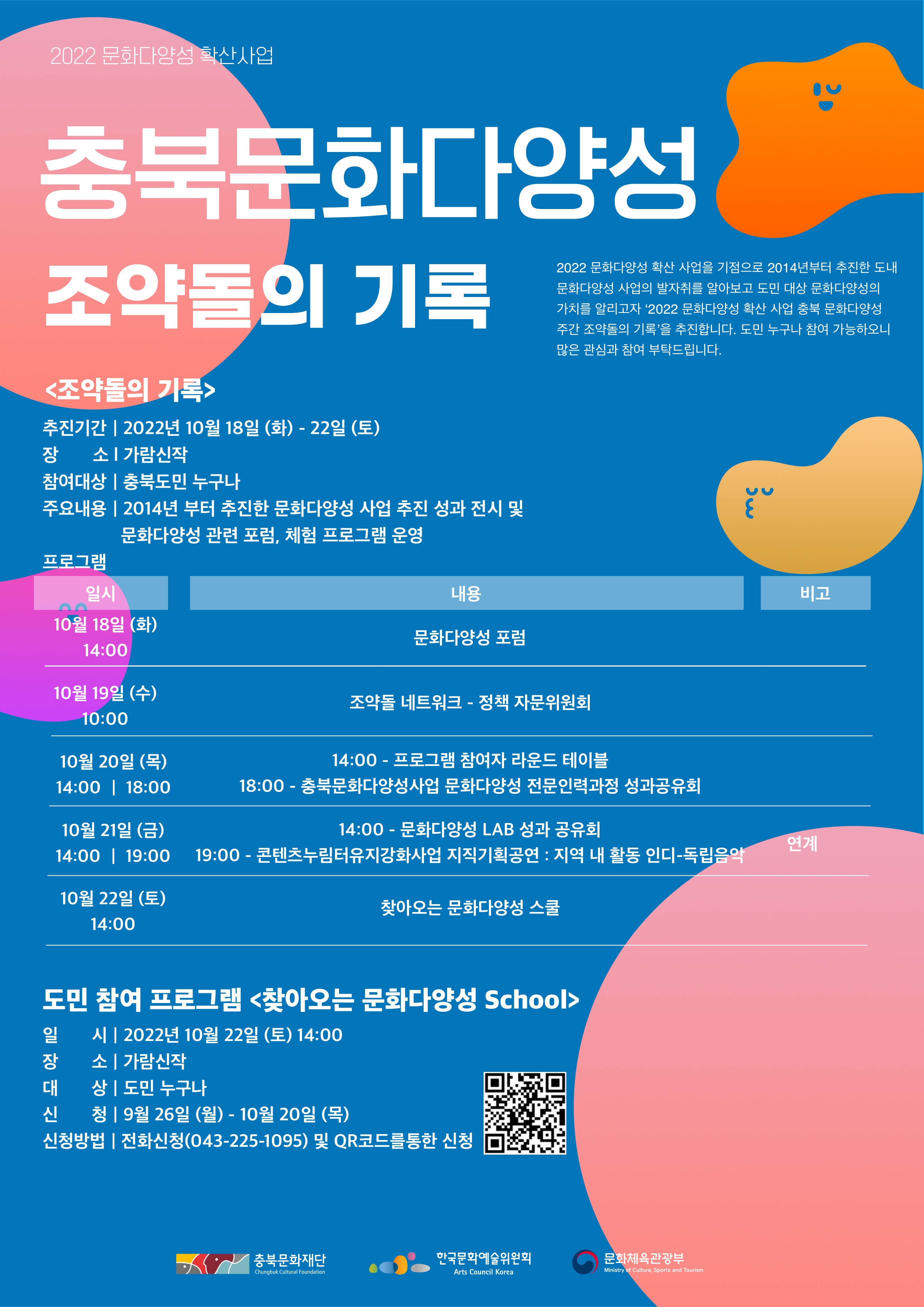 ‘2022 문화다양성 확산 사업 충북 문화다양성 주간 조약돌의 기록’을 추진합니다! 도민 누구나 참여 가능하오니 많은 관심과 참여 부탁드립니다.