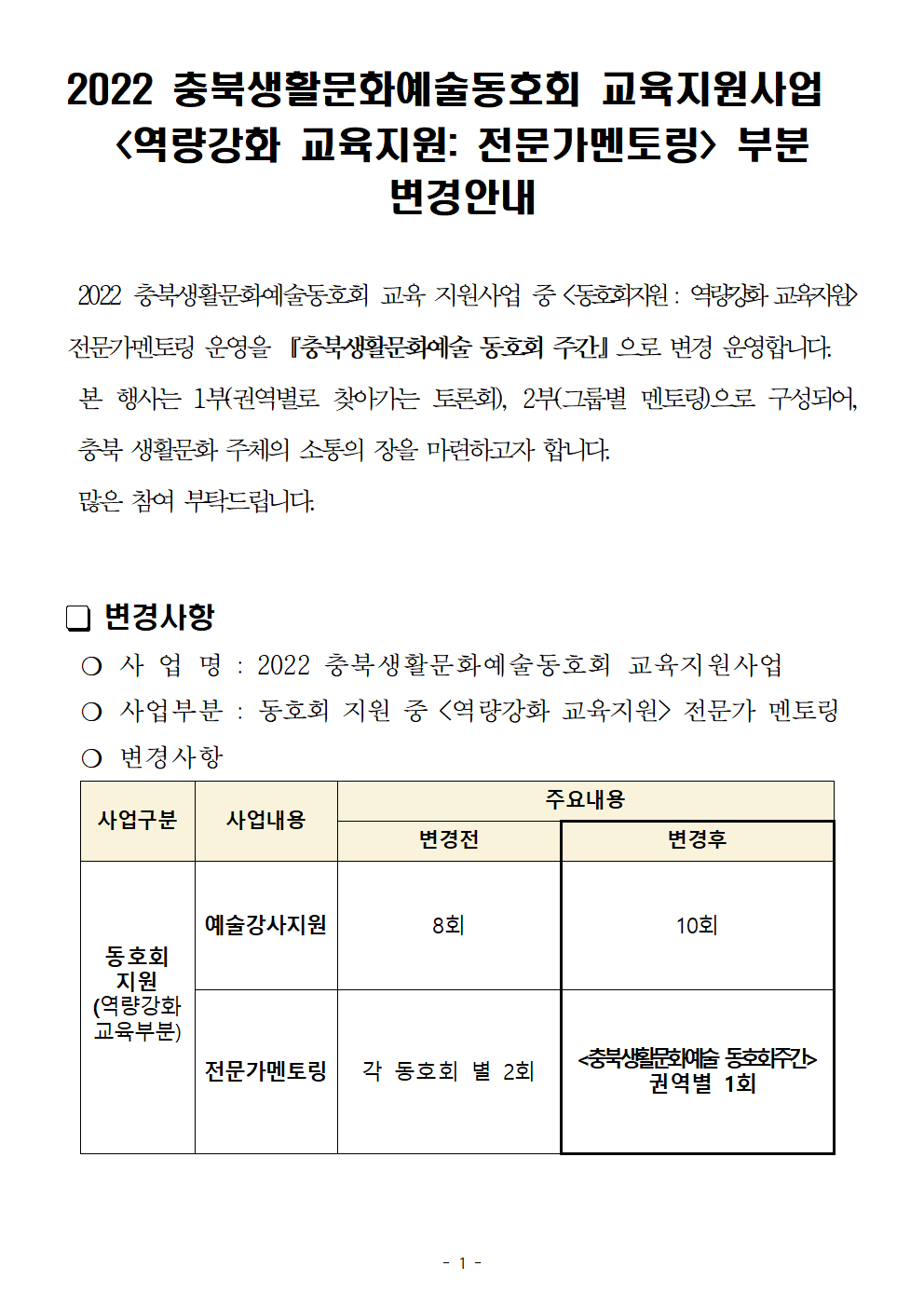 | 2022 충북생활문화예술동호회 교육지원 사업 <역량강화 교육지원: 전문가멘토링> 부분 변경안내 | |||||