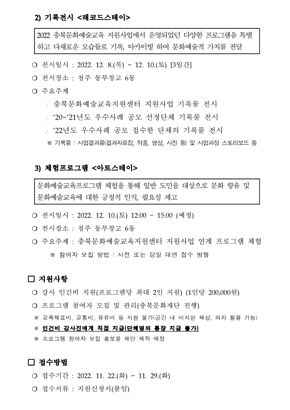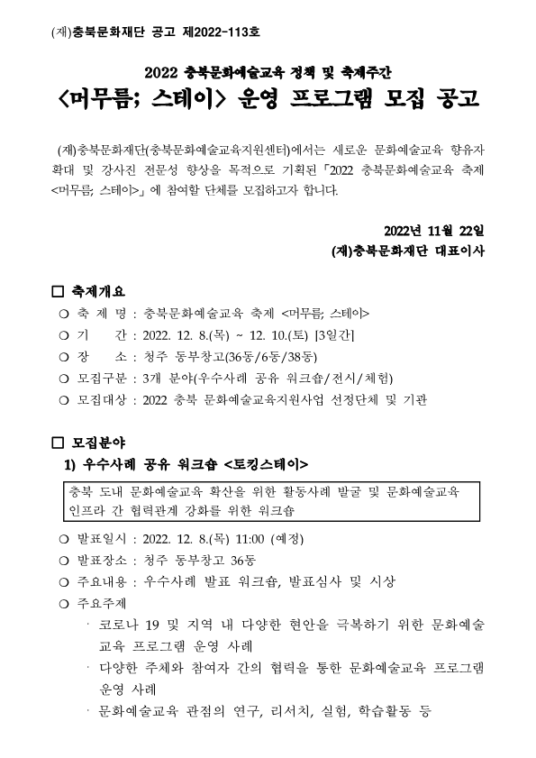 | 2022 충북문화예술교육 정책 및 축제주간 (머무름;스테이)운영 프로그램 모집 공고 | |||||