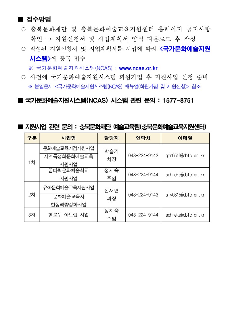 | 2023년 충북문화예술교육 지원사업 공모 일정 안내 | |||||