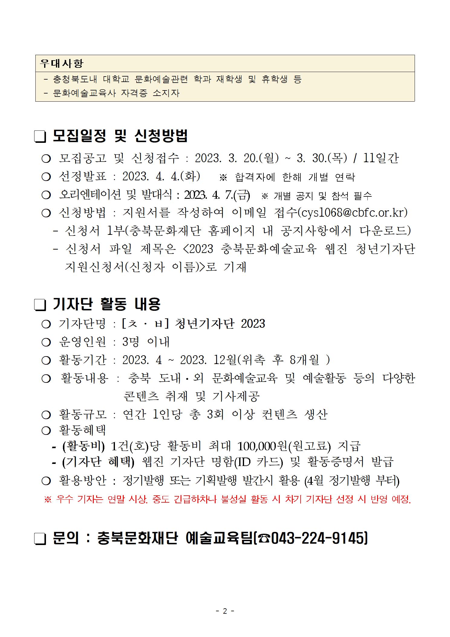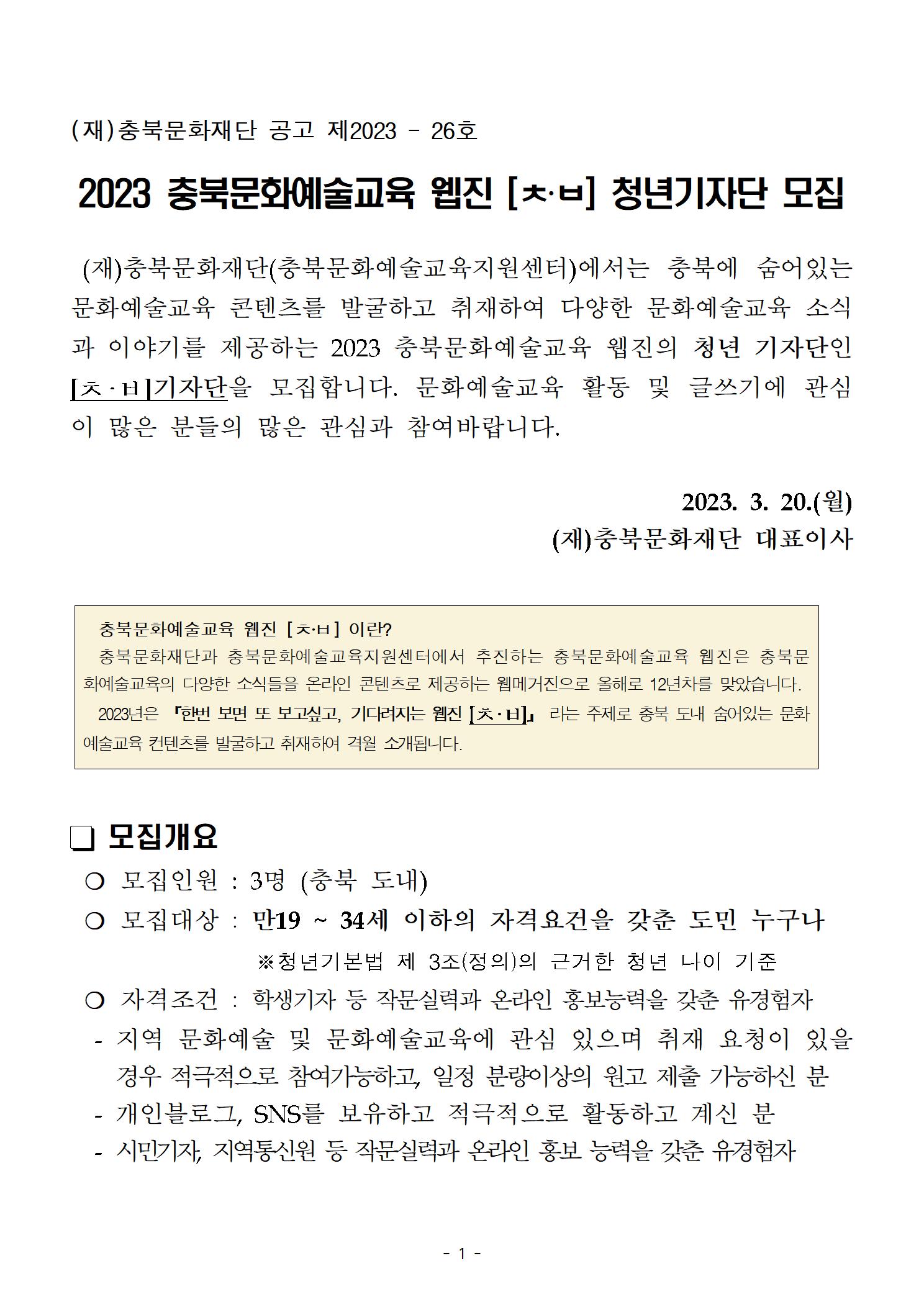 | 2023 충북문화예술교육지원센터 웹진 청년기자단 모집공고 | |||||