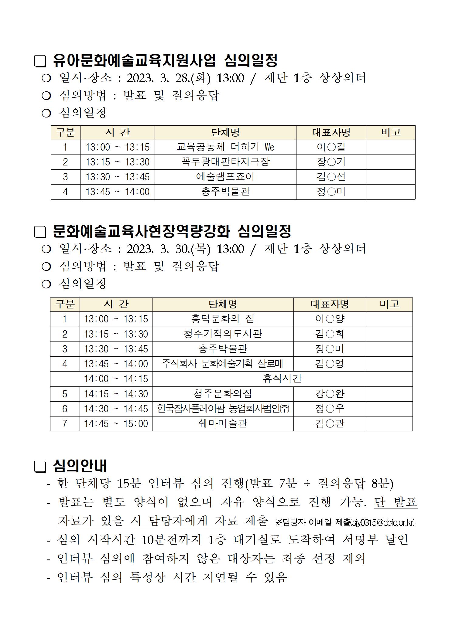 | 2023 충북문화예술교육 지원사업 2차 공모 심의일정 안내 (유아,교육사) | |||||