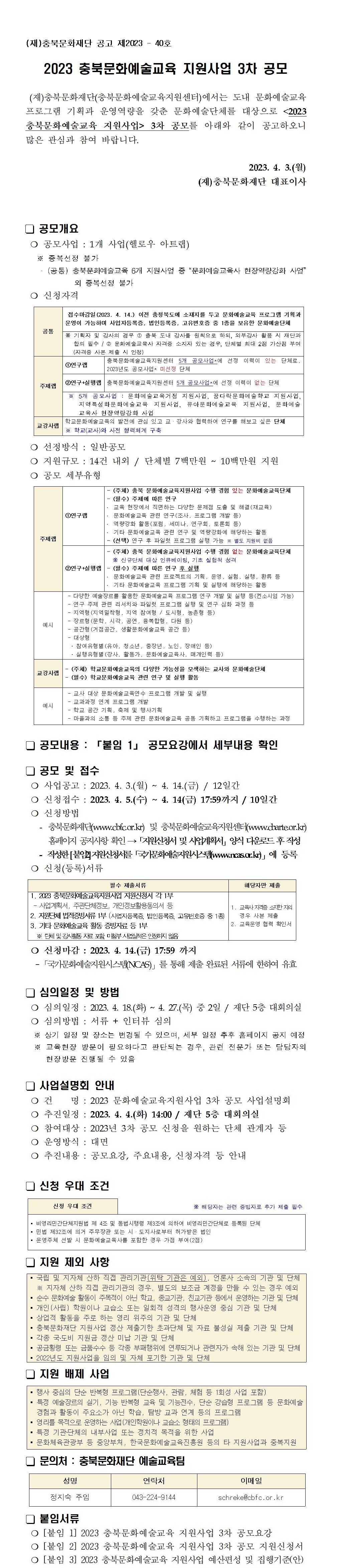 | 2023 충북문화예술교육 지원사업 3차 공모 안내(헬로우 아트랩 사업) | |||||