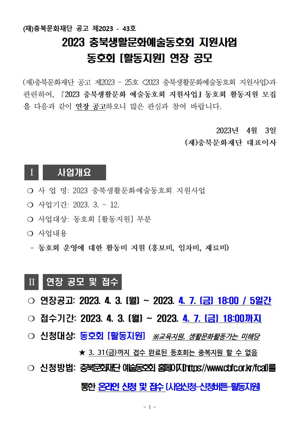 | 2023 충북생활문화예술동호회 지원사업 모집 연장 공고(활동지원분야) | |||||