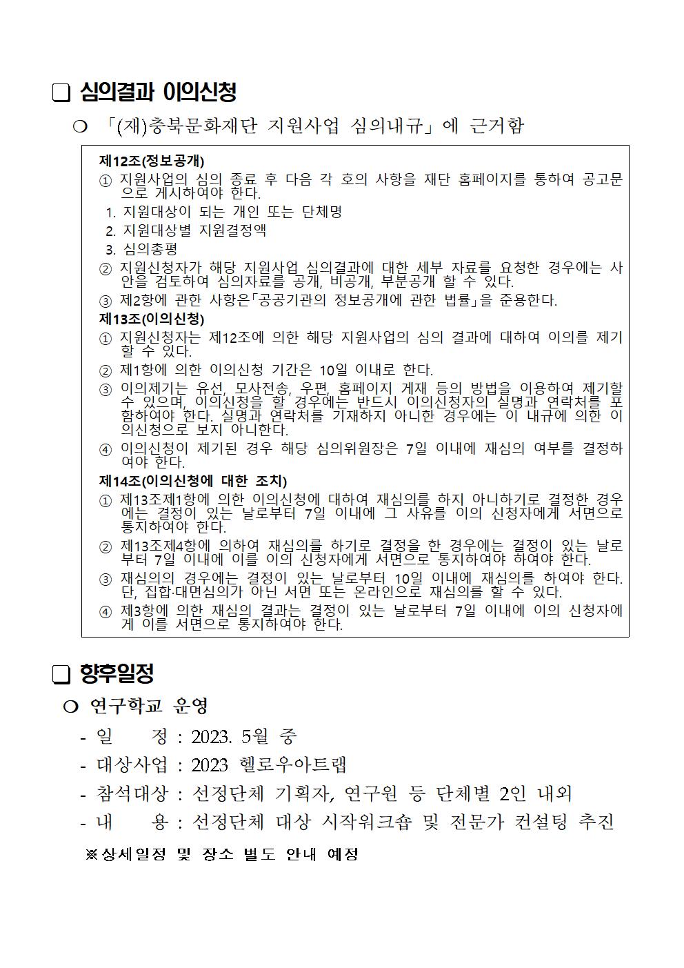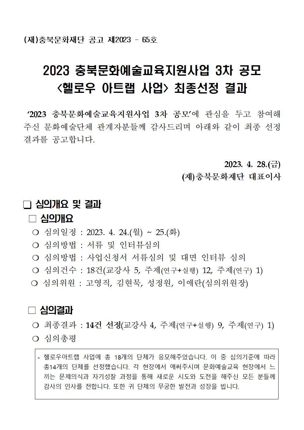 | 2023 충북 문화예술교육 지원사업 3차 공모 최종 선정 결과 안내(헬로우 아트랩) | |||||