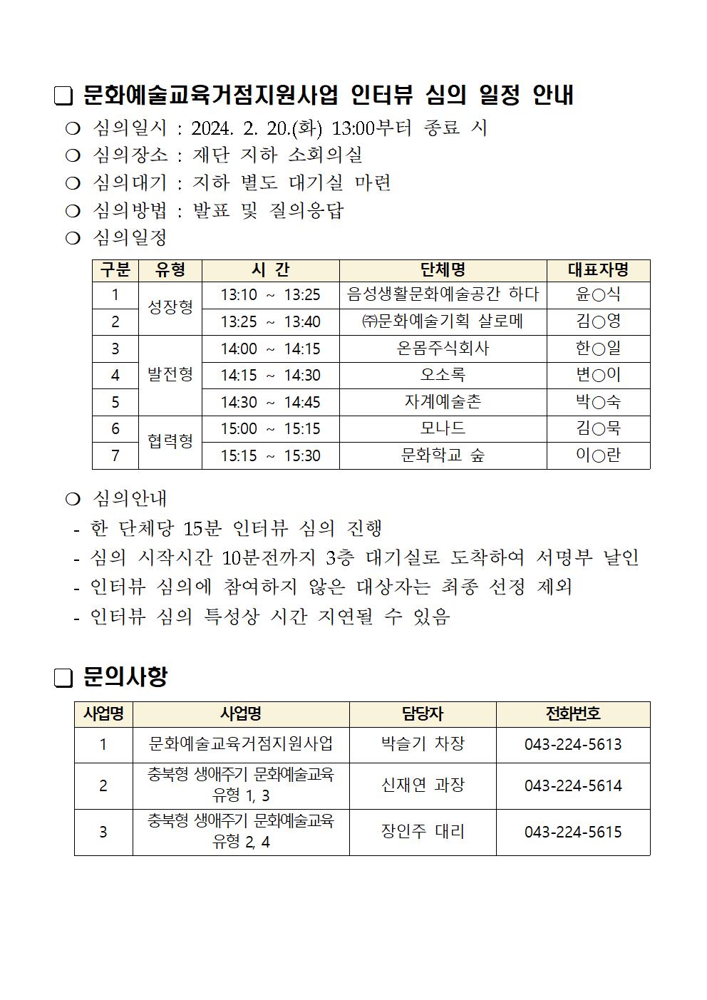 | 2024 충북문화예술교육 지원사업 1차 공모 심의 일정 안내 | |||||