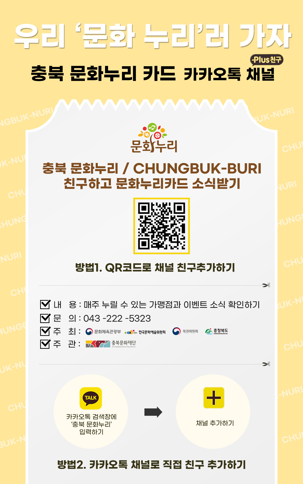 ‘충북문화누리카드 카카오톡 플러스 채널’을 운영합니다.