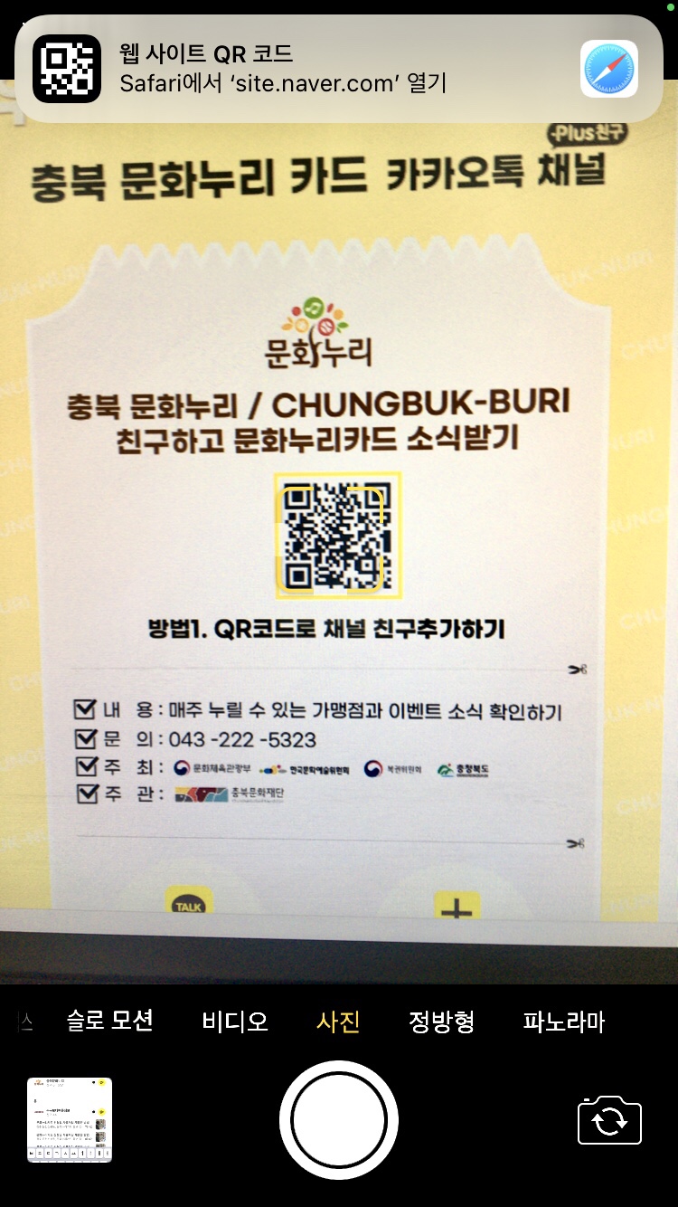 충북 문화누리카드 카카오톡 플러스 채널 개설