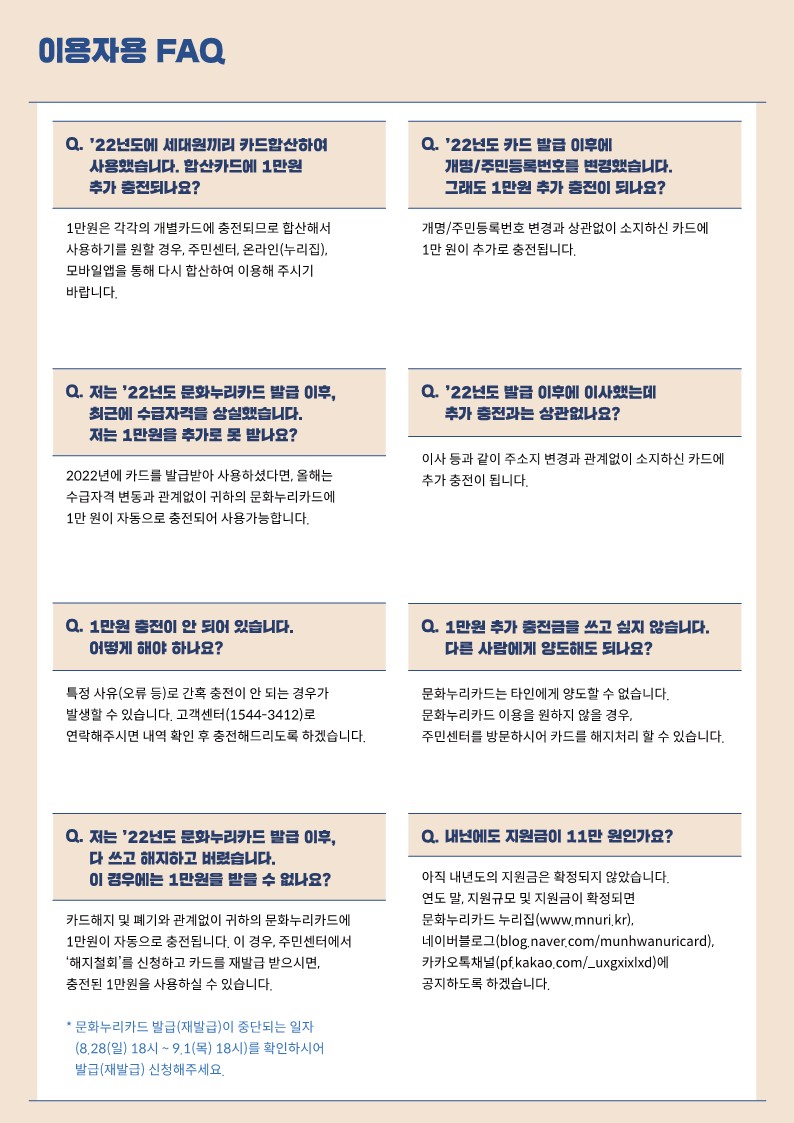 ※ 올해 발급받지 않은 대상자가 발급할 경우 - 온라인(누리집), 모바일앱 : 2022.9.1(목) 18시 이후 발급 가능 (11만원으로 발급) - 주민센터 : 2022.9.2(금) 09시 이후 발급 가능 (11만원으로 발급) ※ 카드분실, 정지, 해지 등으로 카드가 없는 분들은 주민센터/온라인(누리집)/모바일앱을 통해 문화누리카드를 재발급하여 사용할 수 있습니다. ※ 1만원 충전에 관련한 안내(분실, 이용, 합산 등) 세부내용은 FAQ를 참고해주시기 바랍니다. |