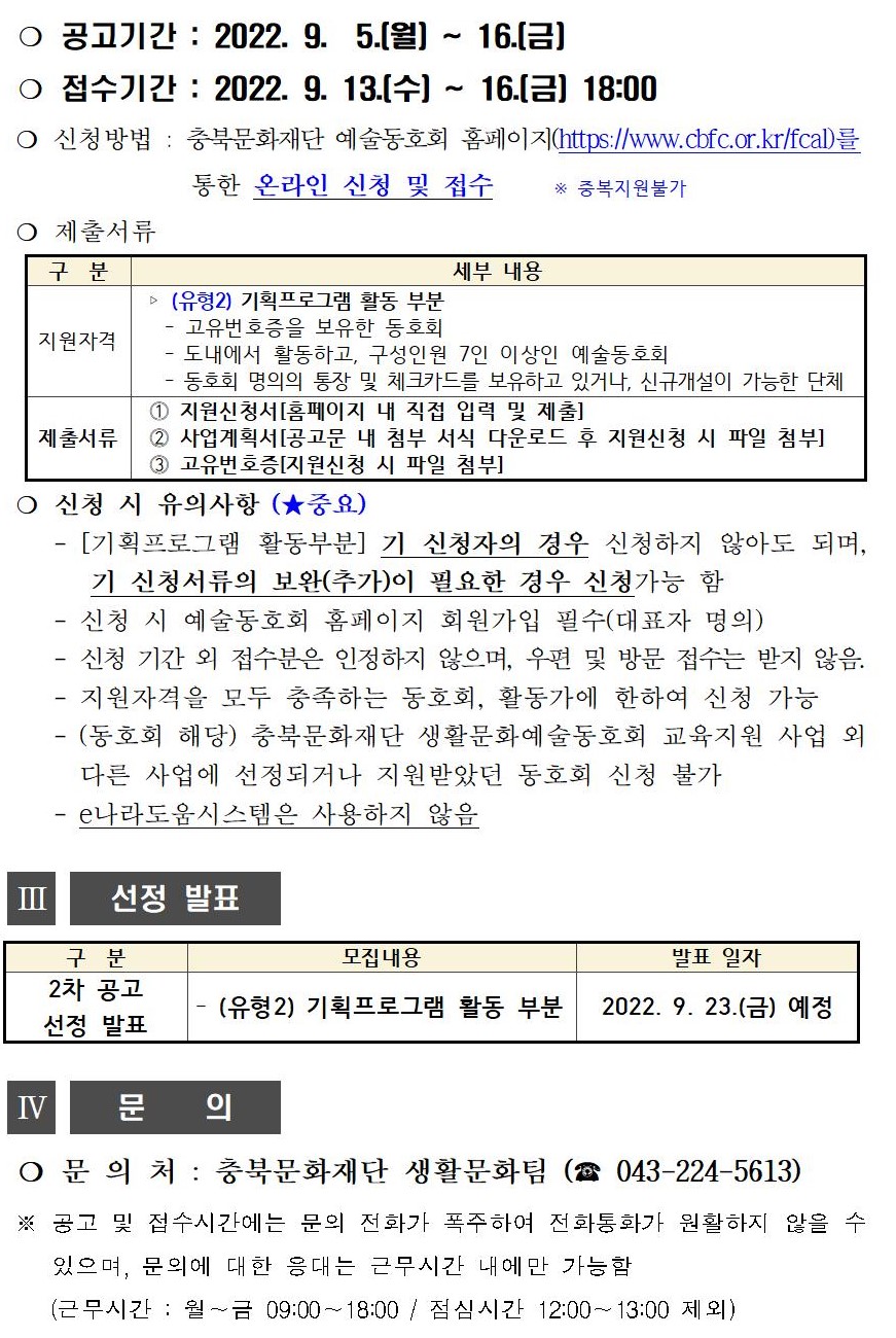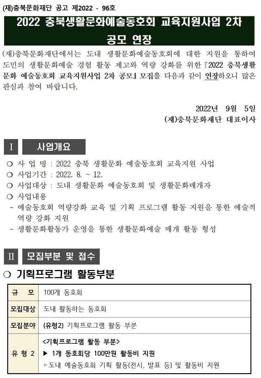 | 2022 충북생활문화예술동호회교육지원사업 2차 공모 연장 공고 | |||||