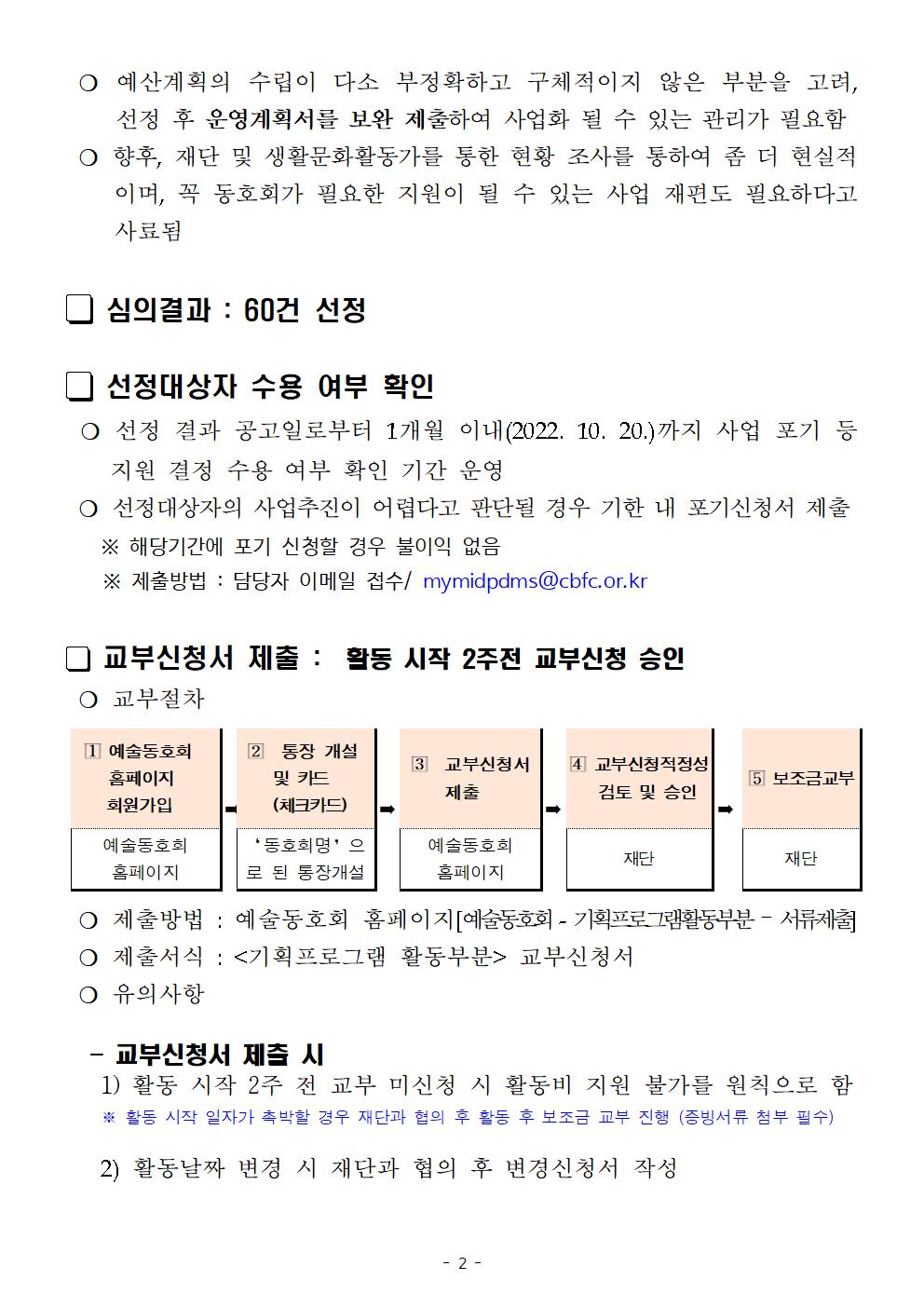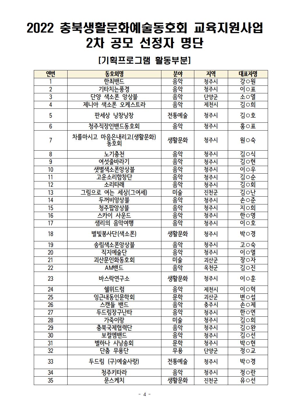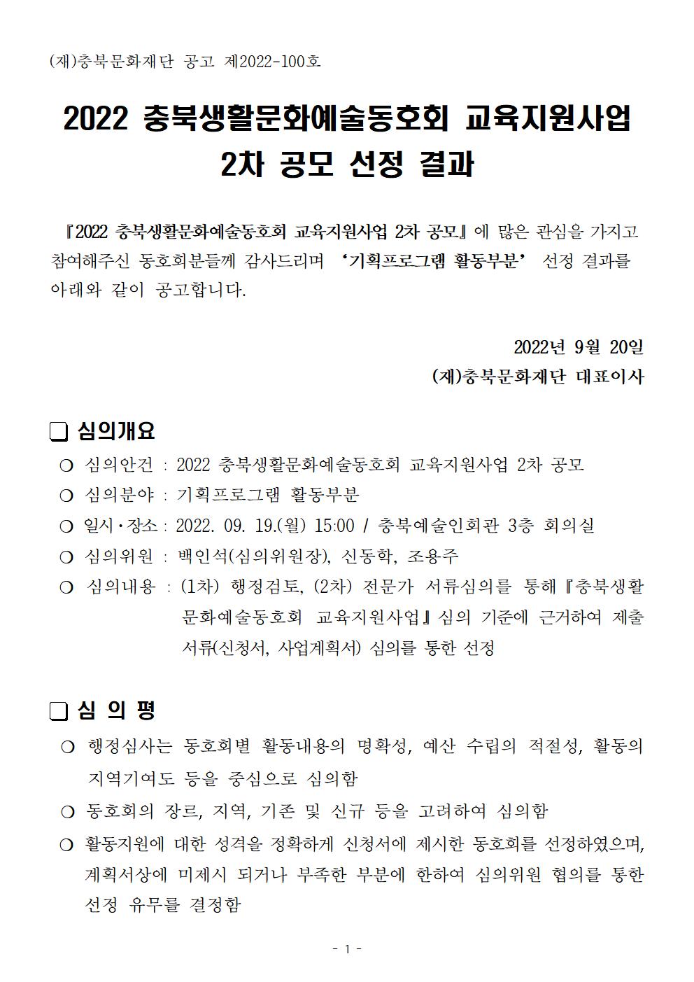 | 2022 충북생활문화예술동호회 교육지원사업 2차 공모 최종심의 결과 | |||||