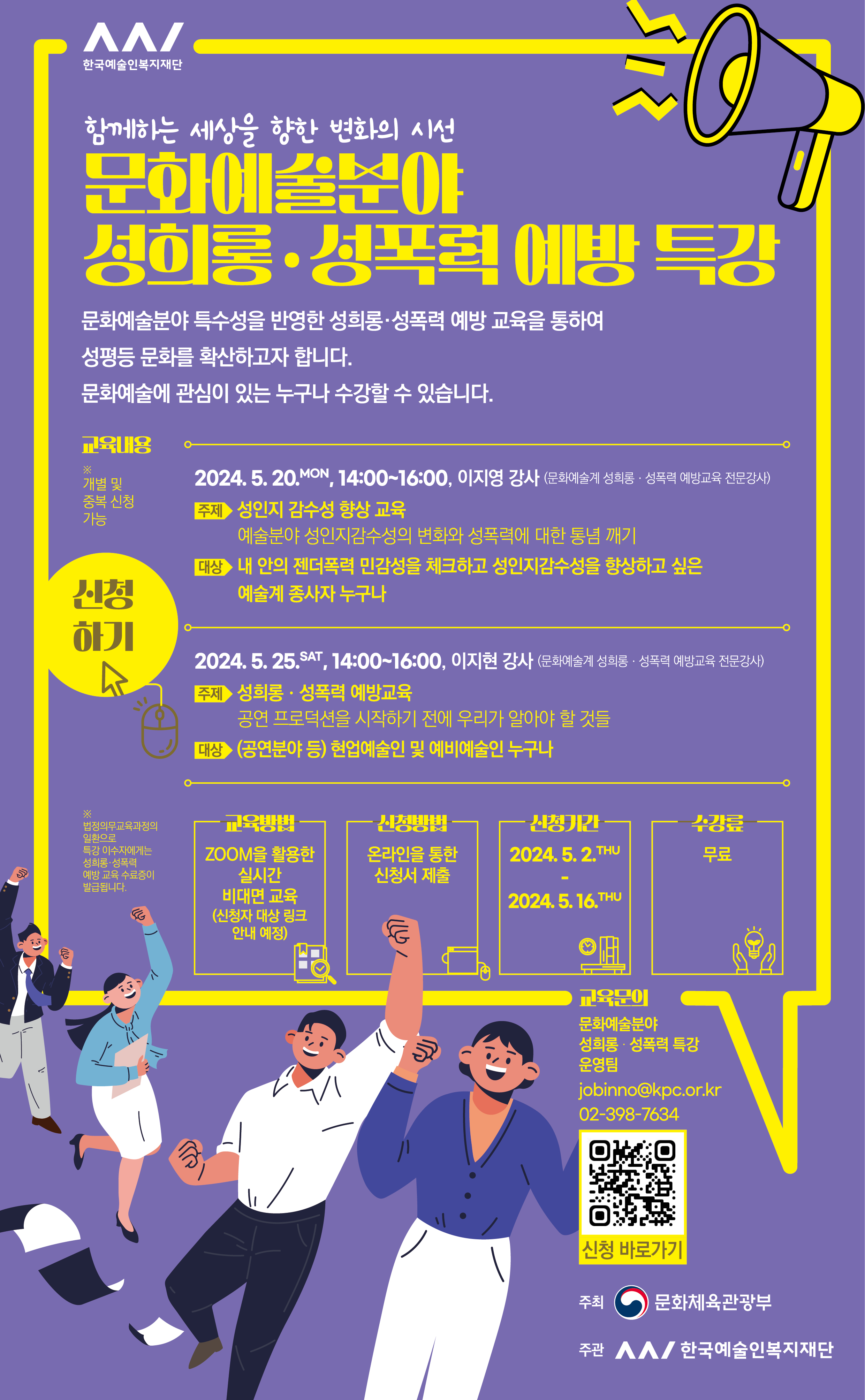 한국예술인복지재단에서 주관하는 문화예술분야 성희롱·성폭력 예방 특강에 많은 참여 부탁드립니다.(무료)