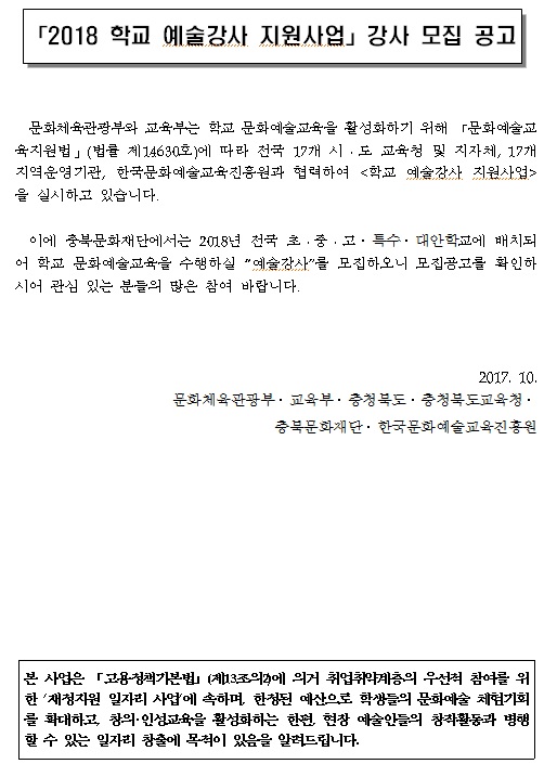 | 2018년도 학교예술강사 지원사업 강사 모집 공고 | |||||