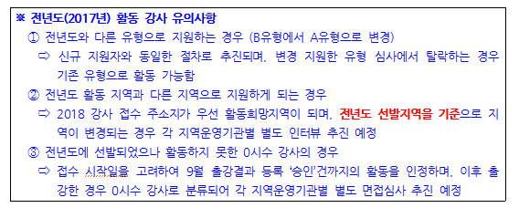 - 2018 강사 접수 주소지가 우선 활동지망지역이 되며, '전년도 선발지역을 기준' 으로