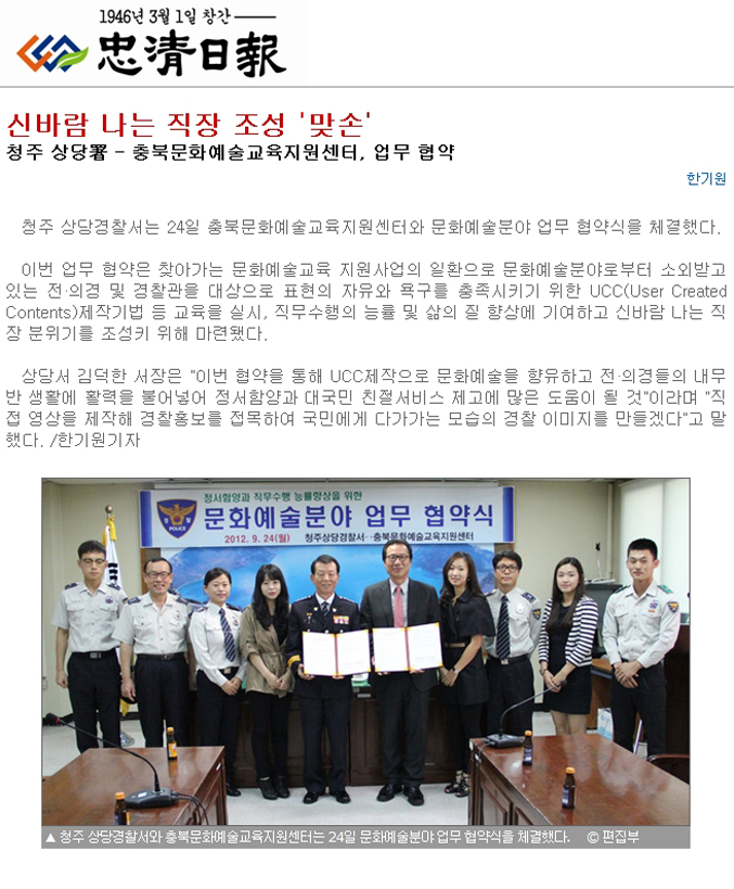 | [충청일보] 충북센터-청주상당경찰서 신바람나는 직장 조성 '맞손' | |||||