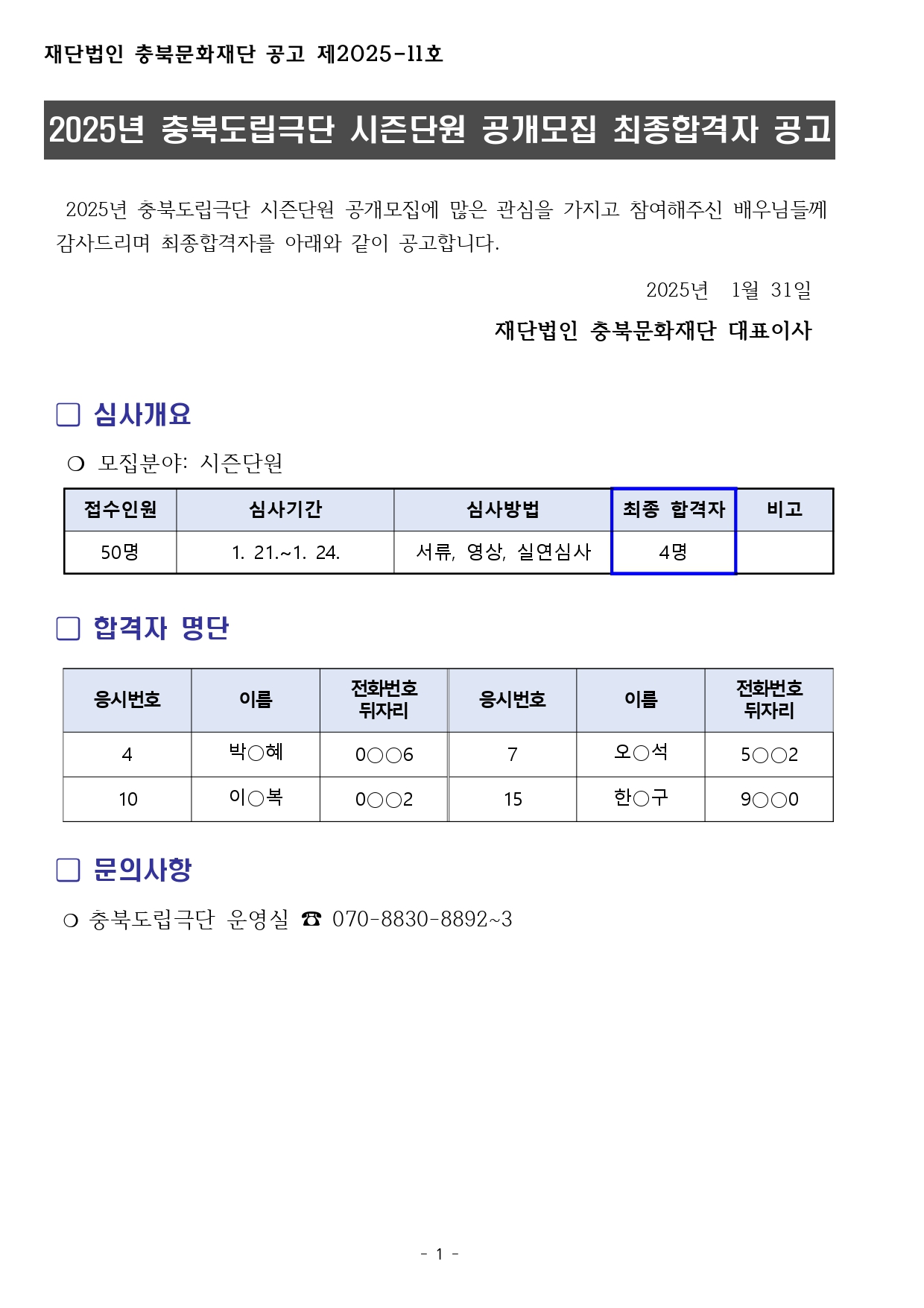 | 2025년 충북도립극단 시즌단원 공개모집 최종합격자 발표 | |||||