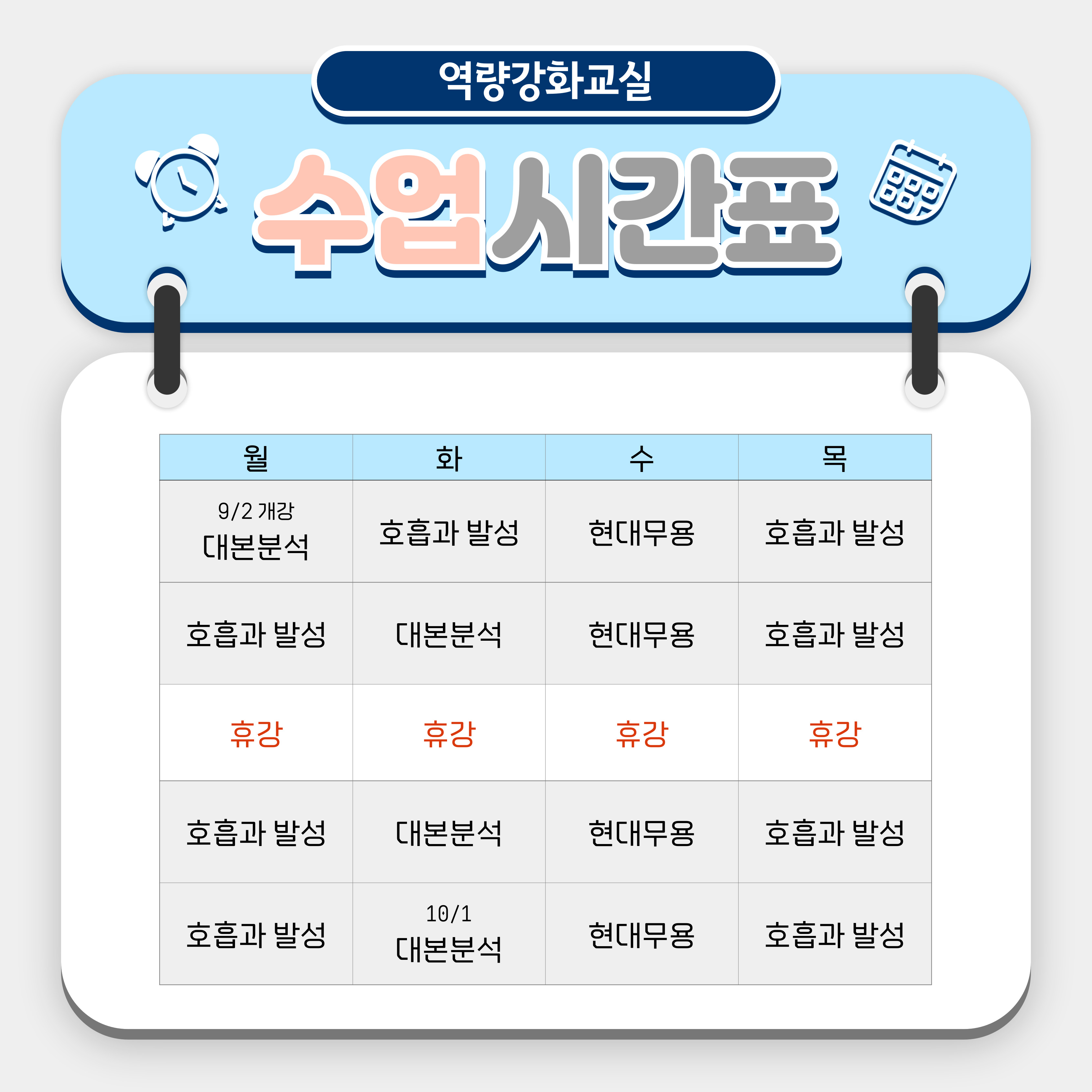 역량강화교실 수강자께서는 시간표를 확인하시어 수업 일정에 착오 없으시기 바랍니다.