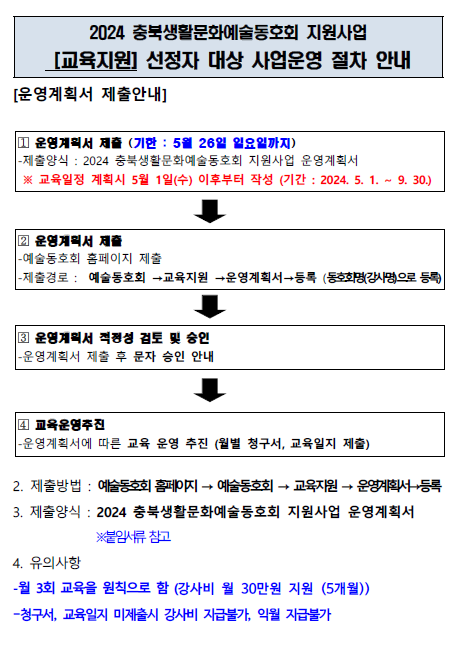 | 2024 충북생활문화예술동호회 지원사업 선정자 대상 사업운영 절차 안내(교육지원) 수정 | |||||