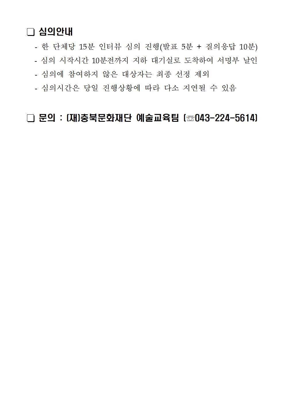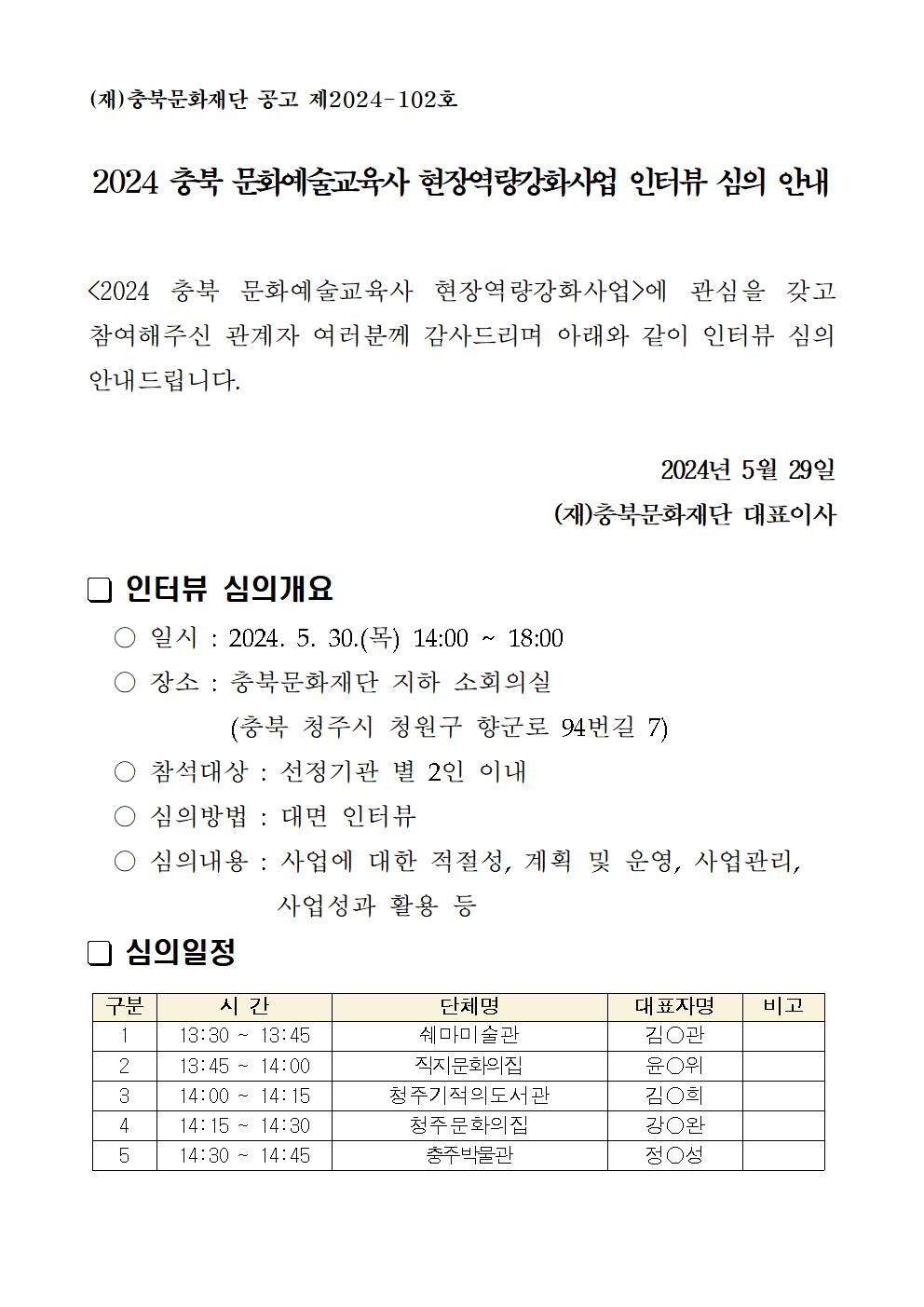 | 2024 충북 문화예술교육사현장역량강화사업 인터뷰 심의 안내 | |||||