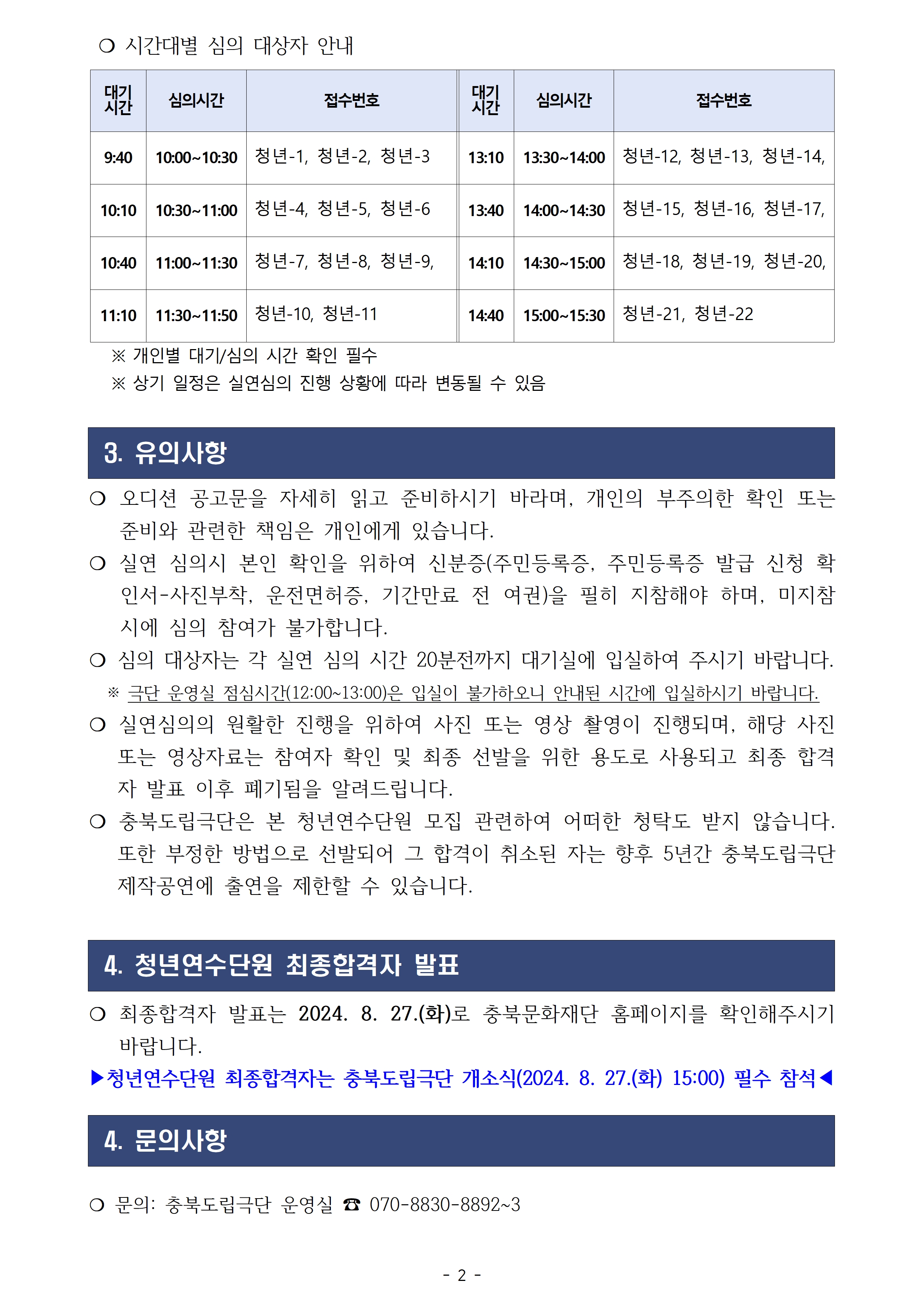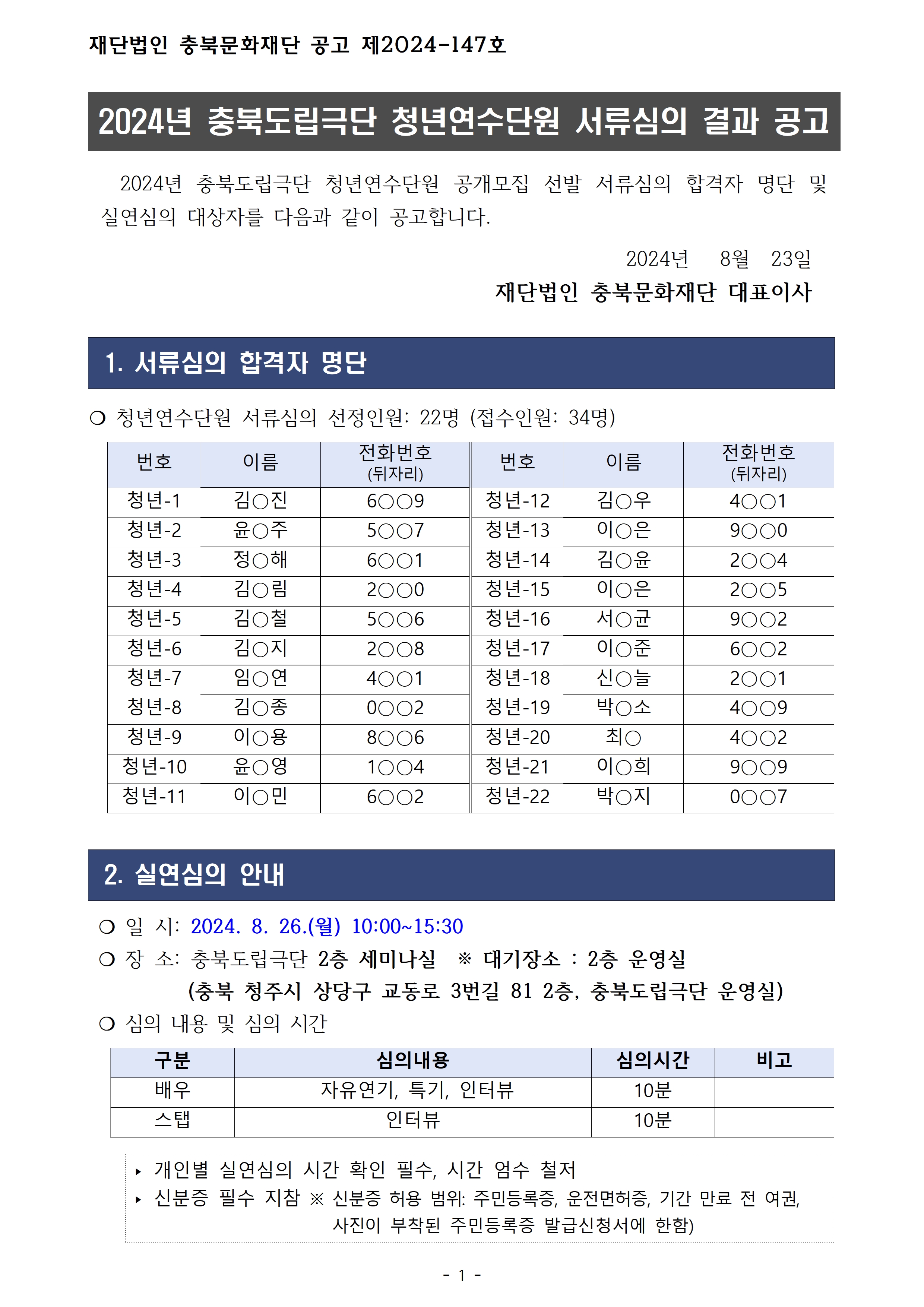 | 2024년 충북도립극단 청년연수단원 서류심의 결과 공고 | |||||