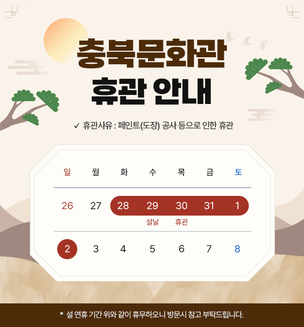 | 2025년 충북문화관 임시휴관 안내(25. 1. 28.~ 2. 2.) | |||||