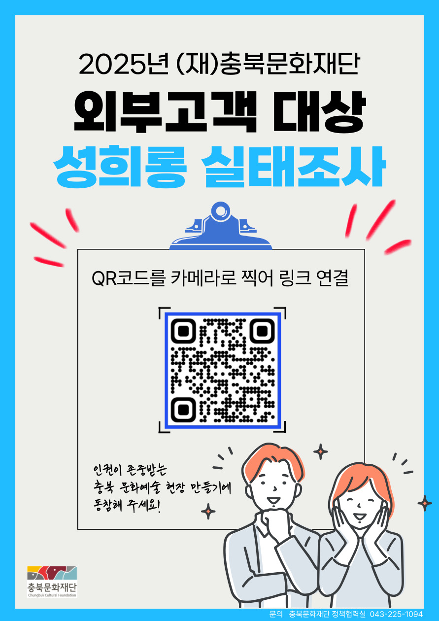 충북 지역 문화예술이용객을 대상으로 한 「2025년 (재)충북문화재단 인권 실태조사」를 실시하고 있습니다.