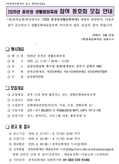 | 2025년 충청권 생활문화축제 참여 동호회 모집 공고 | |||||