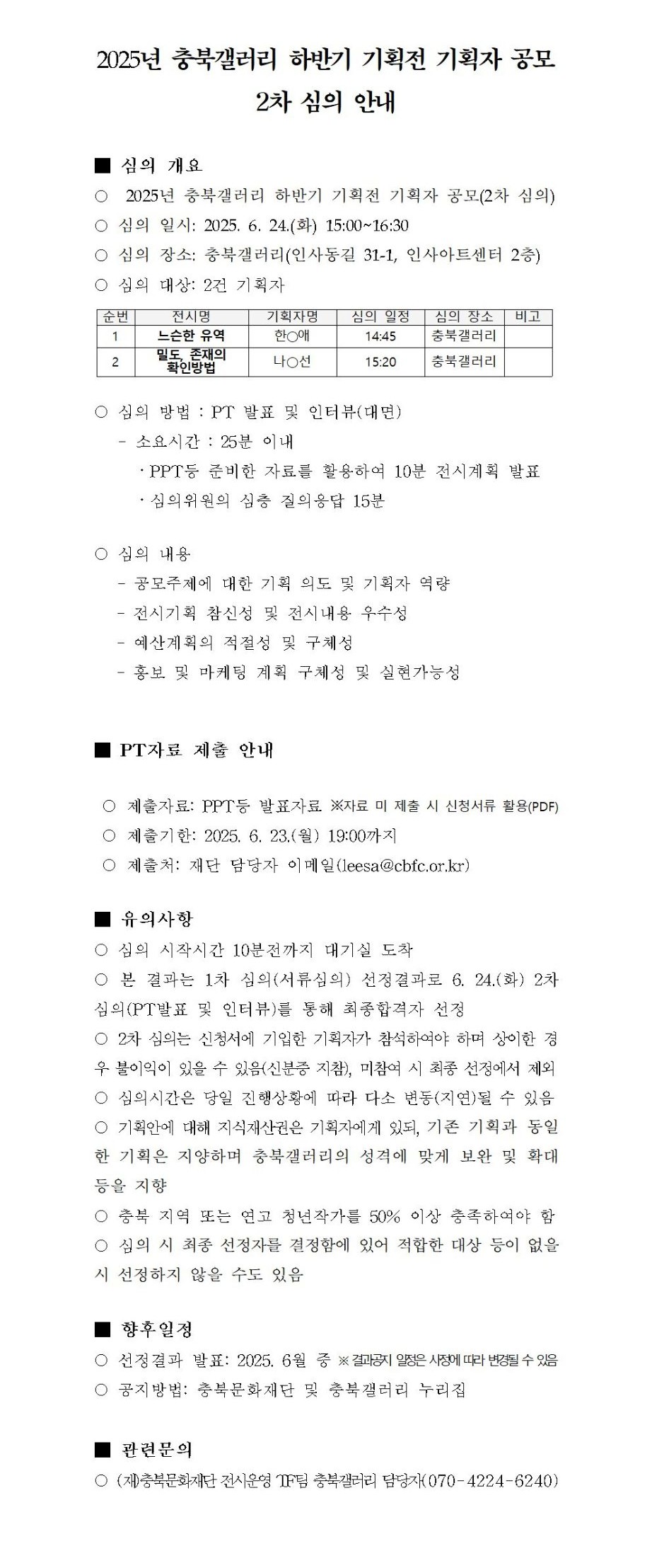 | 2025년 충북갤러리 하반기 기획전 기획자 공모 2차 심의 안내 | |||||