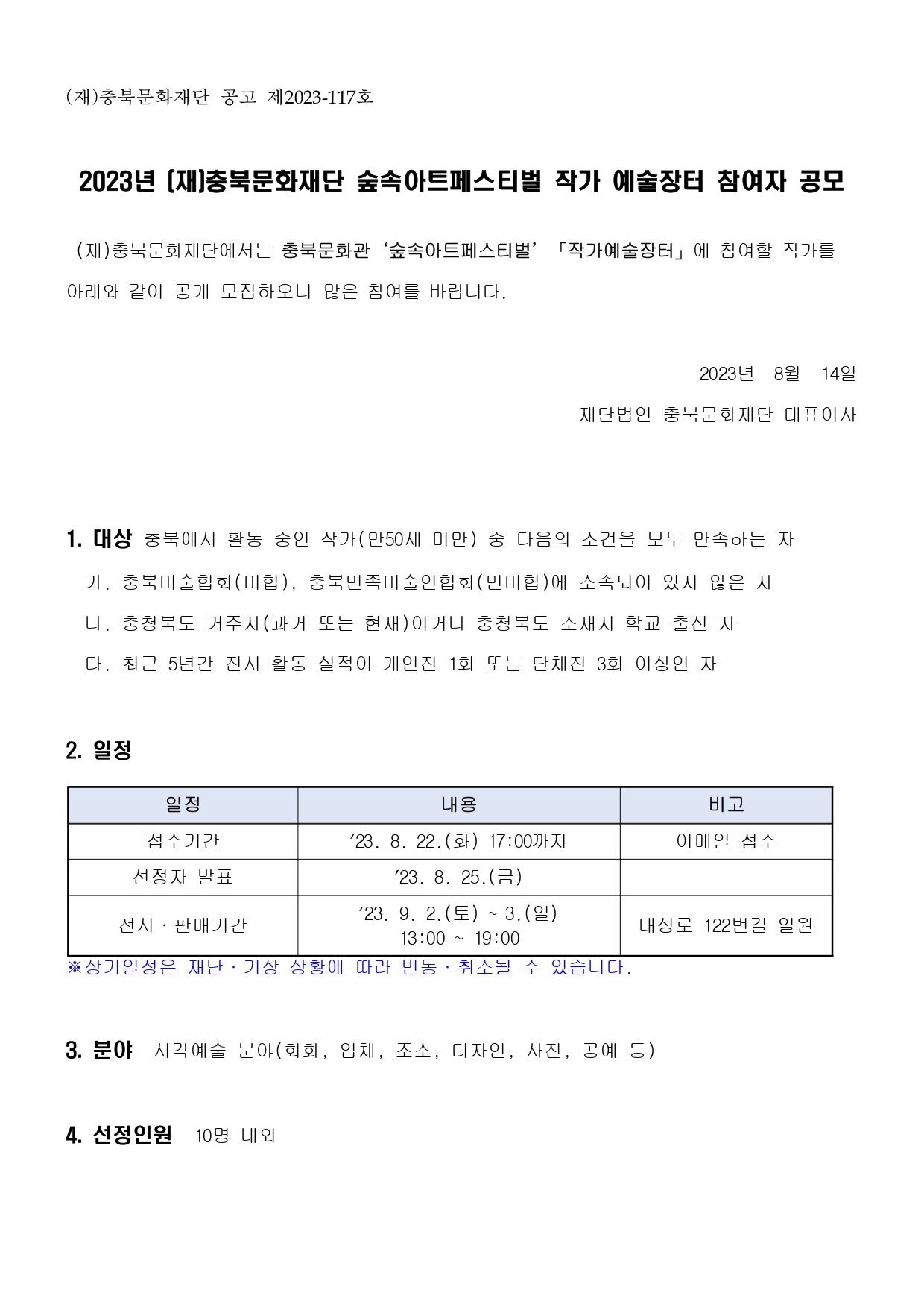 | [공고문](재)충북문화재단 숲속아트페스티벌 작가 공모 | |||||