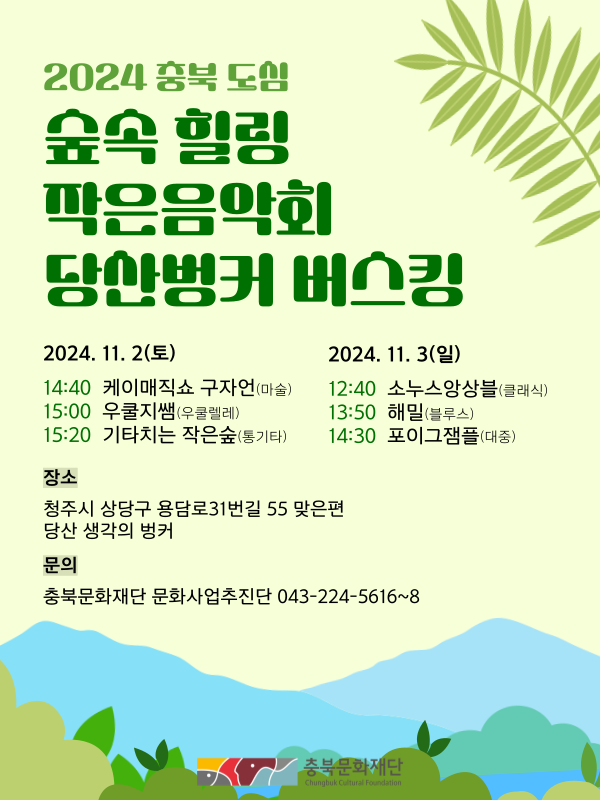 | 2024 충북 도심 숲속 힐링 작은음악회 당산벙커 버스킹 소식 알림 | |||||