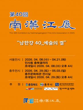 충북갤러리 남한강전 단체전 《남한강 40_예술의 결》2026-04-08 ~ 2026-04-20충북갤러리(서울특별시 종로구 인사동길 41-1 인사아트센터 2층) - 행사