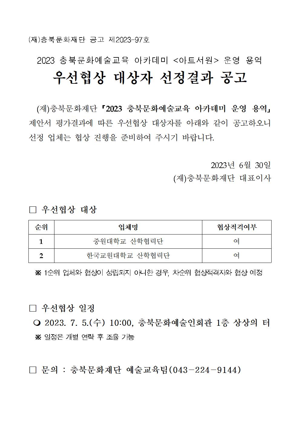 | 2023 충북문화예술교육 아카데미 <아트서원> 운영 용역 우선협상 대상자 선정결과 공고 | |||||