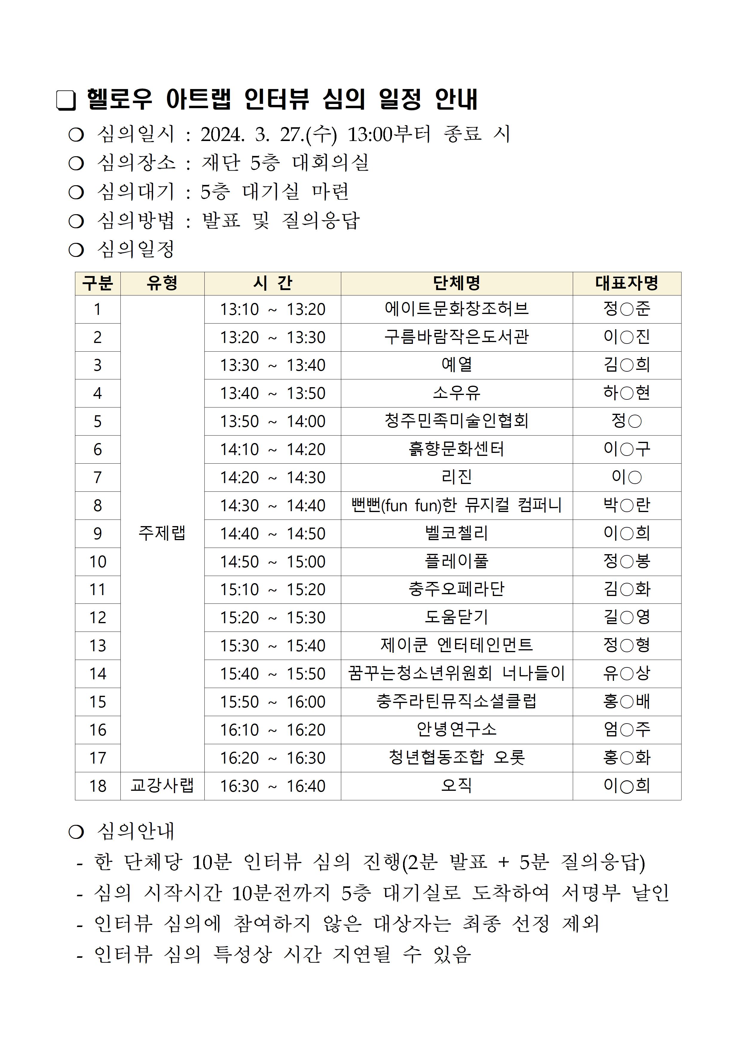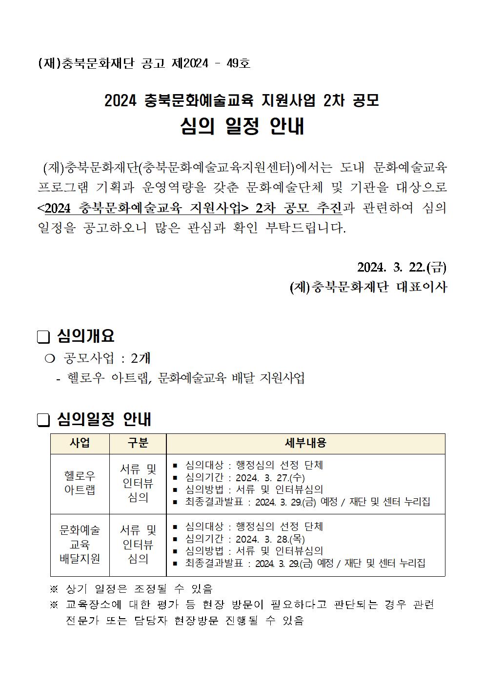 | 2024 충북문화예술교육지원사업 2차 공모 심의 일정 안내 | |||||