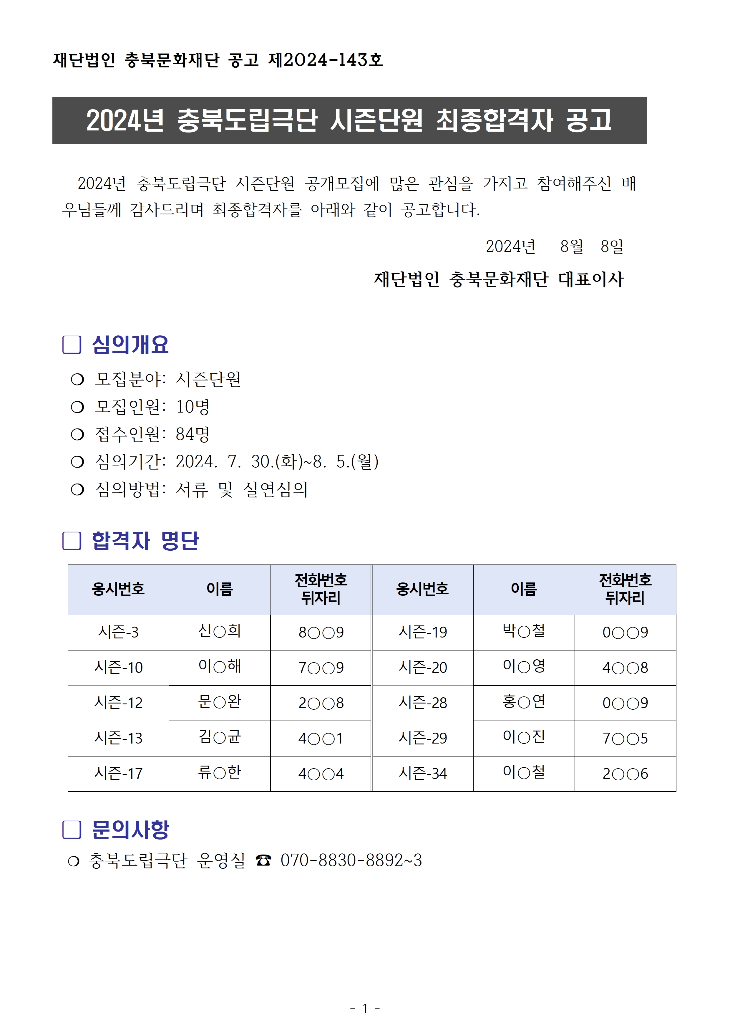 | 2024년 충북도립극단 시즌단원 최종합격자 공고 | |||||