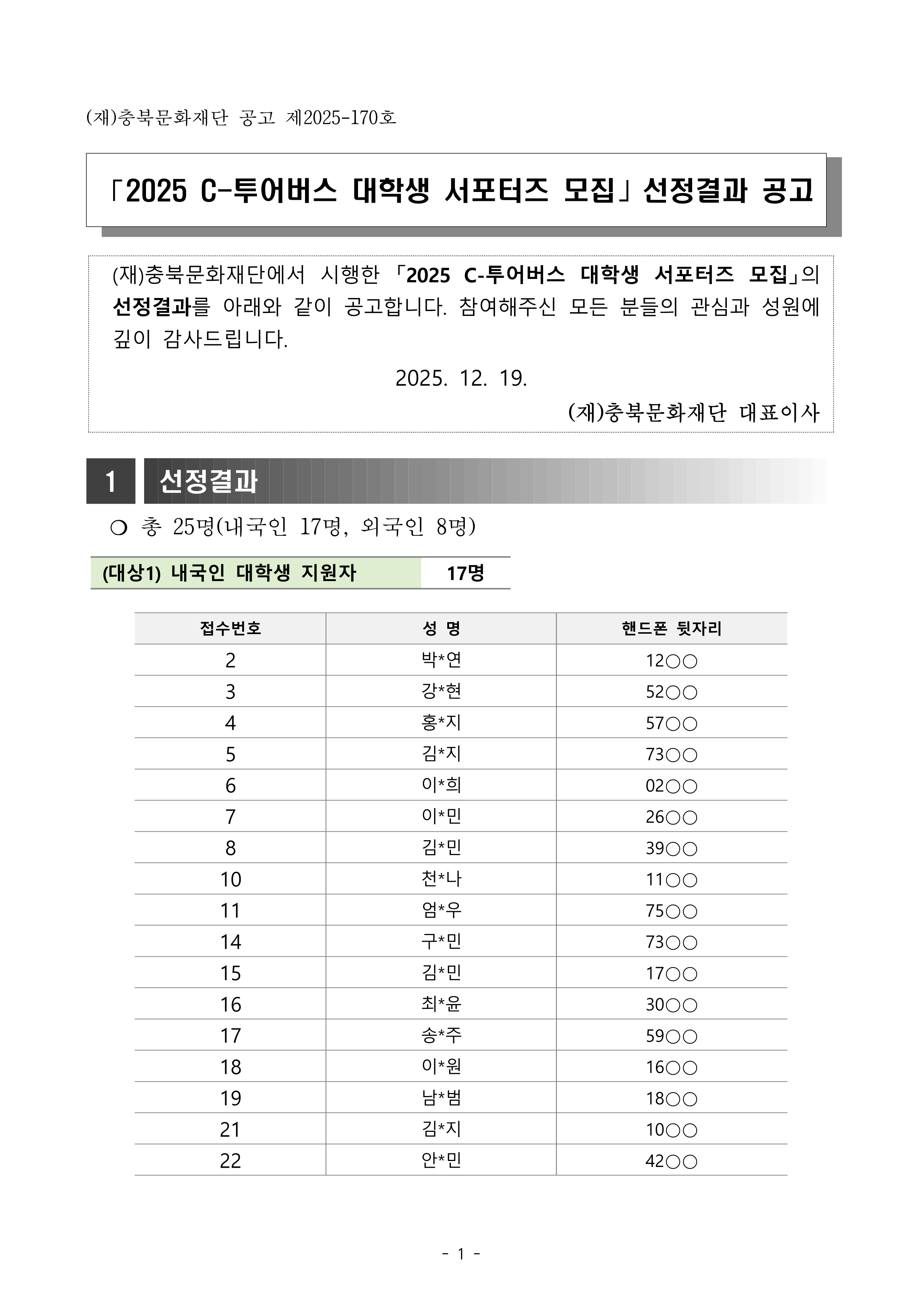 | 2025 C-투어버스 대학생 서포터즈 선정결과 공고 | |||||