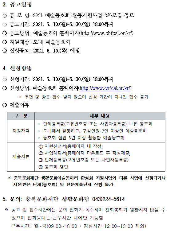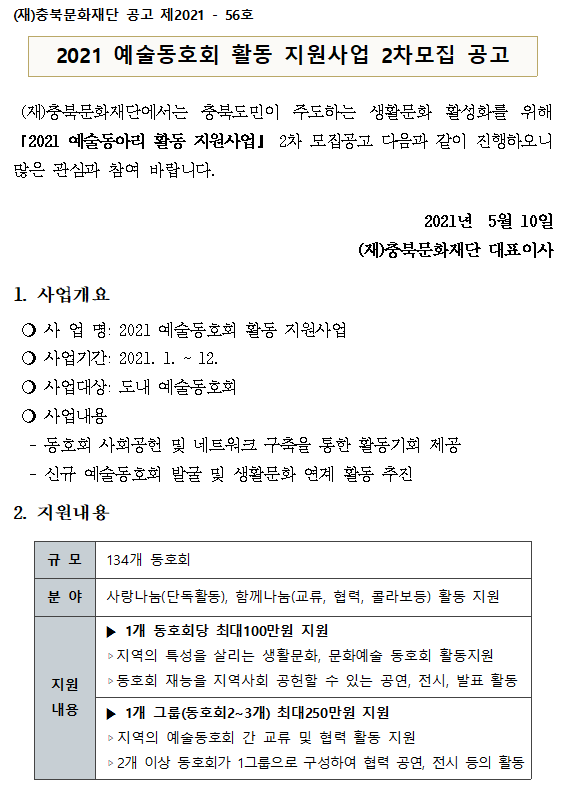 | 2021 예술동호회 활동 지원사업 2차 모집공고 | |||||