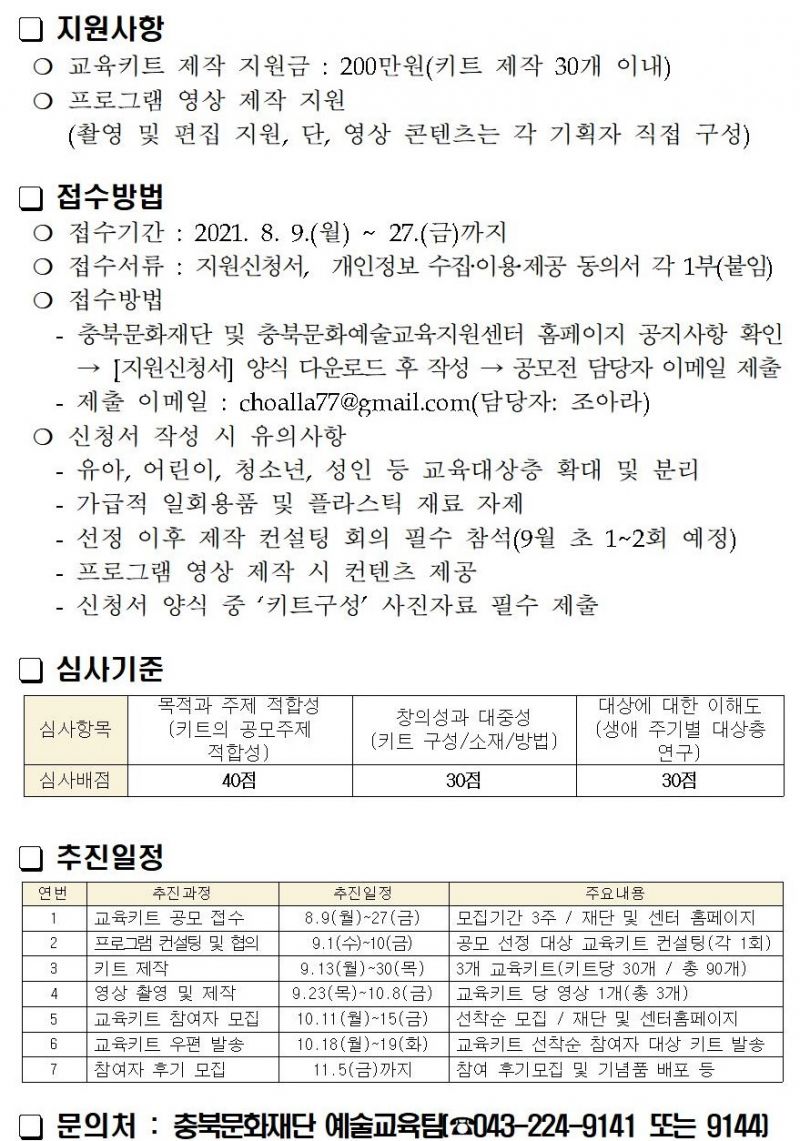 | 2021 충북문화예술교육 가족예술캠프 (집콕캠프 2) 교육키트 공모 공고 | |||||
