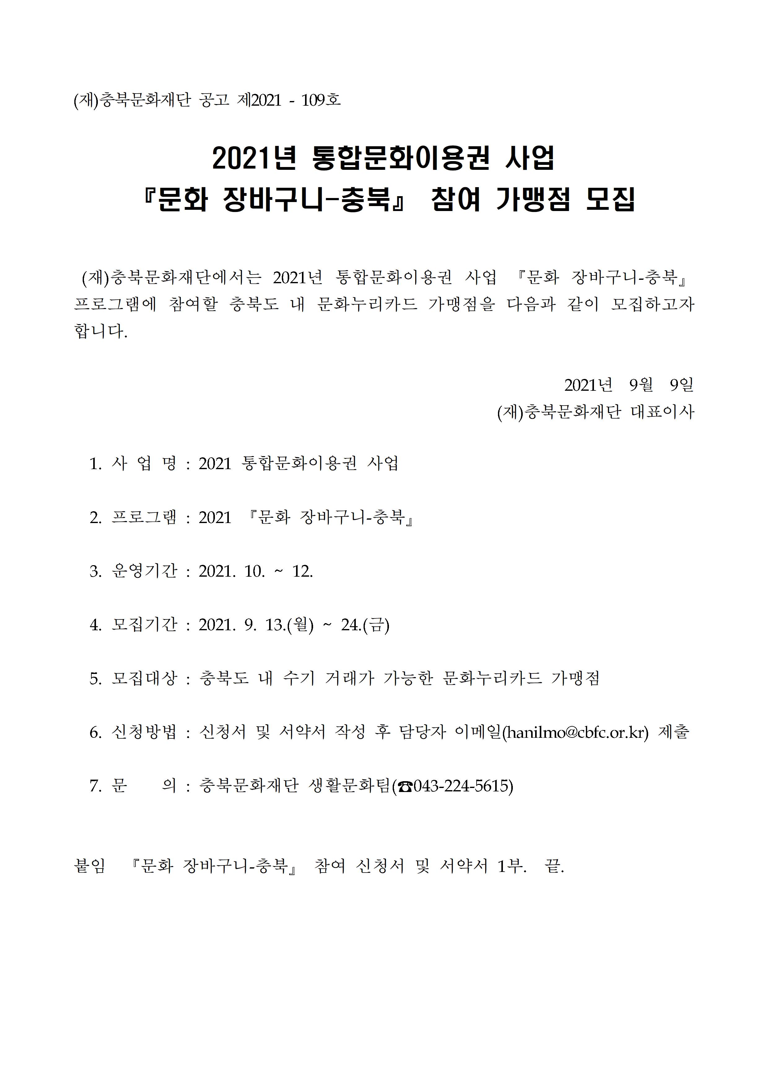 | 2021년 통합문화이용권 사업 『문화 장바구니-충북』 참여 가맹점 모집 | |||||