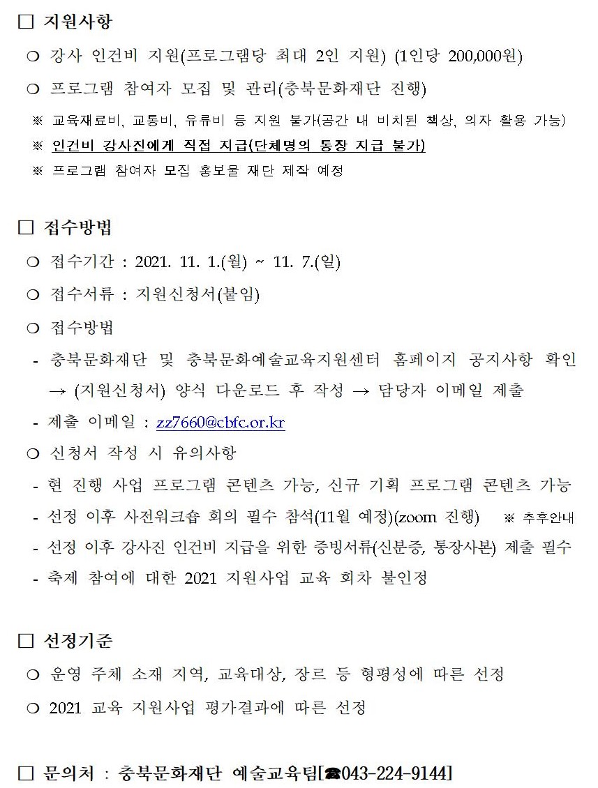 | 작성자 | 충북문화예술교육지원센터 | 등록일 | 2021/11/01 | 조회 | 4315 |