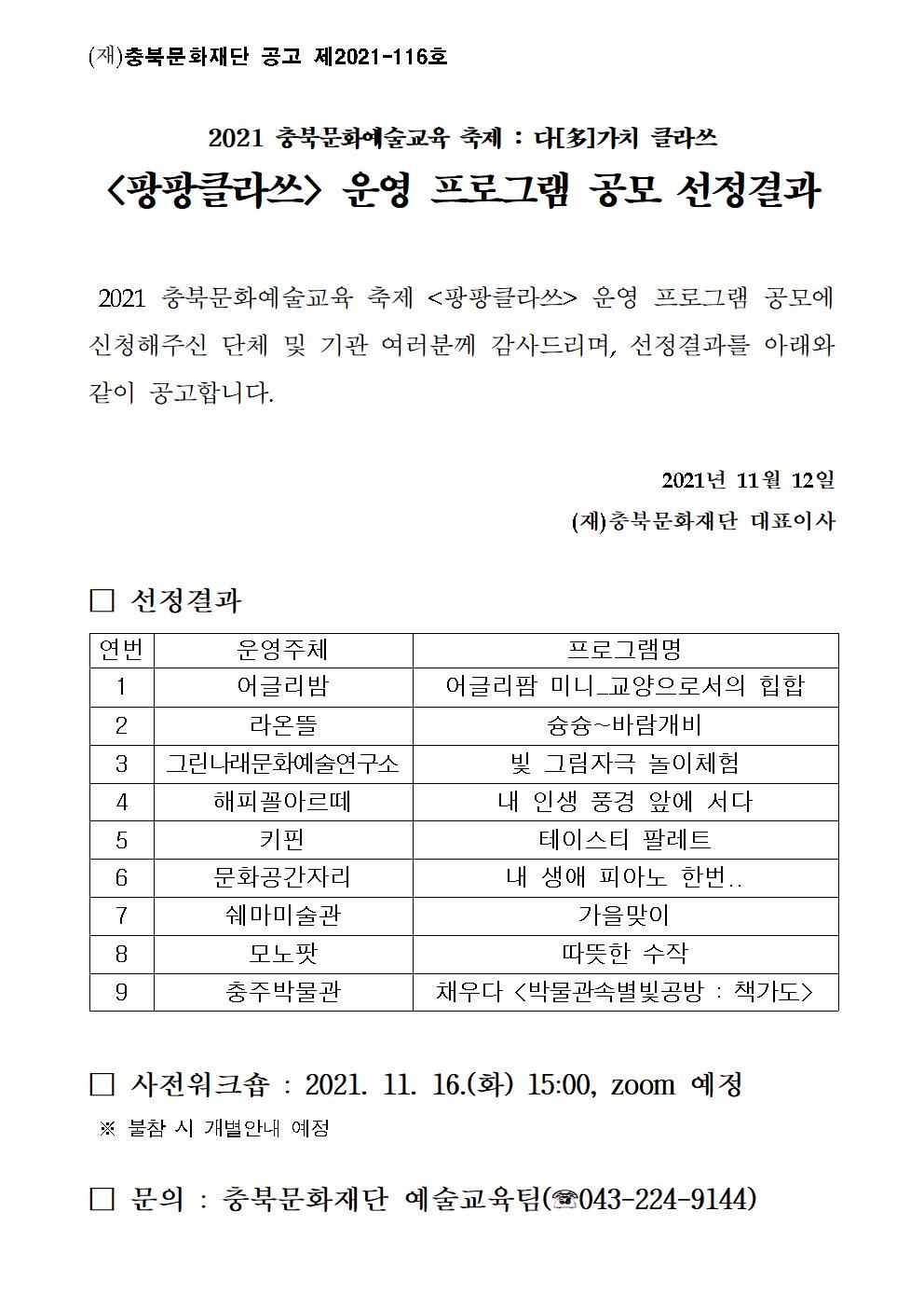 | 2021 충북문화예술교육 축제 <팡팡클라쓰> 운영 프로그램 공모 선정결과 | |||||