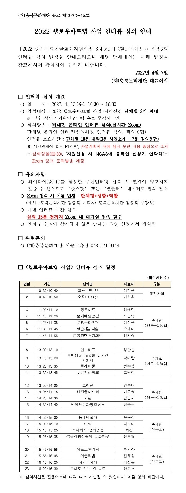 | 2022 헬로우아트랩 사업 인터뷰 심의 안내 | |||||