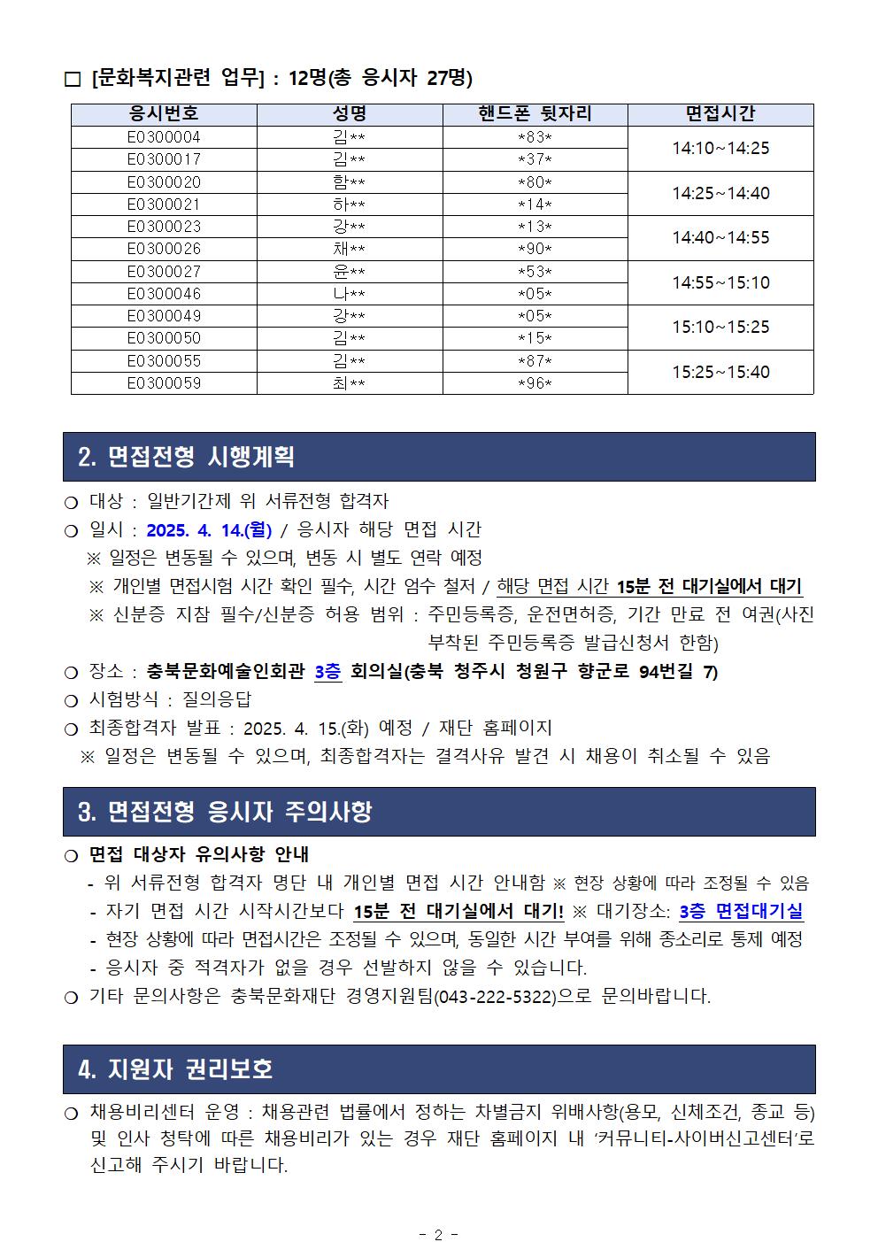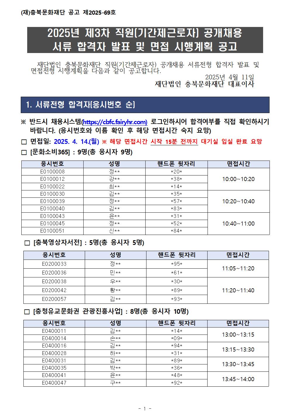| 2025년 제3차 직원(기간제 근로자) 채용 서류전형 합격자 발표 및 면접전형 시행계획 공고 | |||||