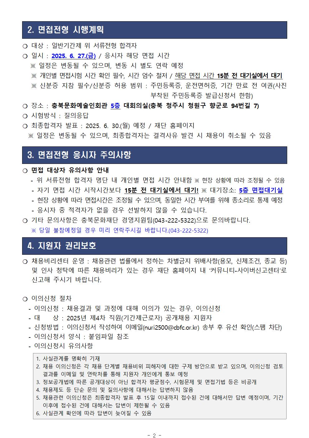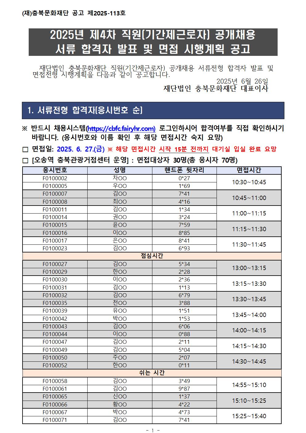 | 2025년 제4차 직원(기간제 근로자) 채용 서류전형 합격자 발표 및 면접전형 시행계획 공고 | |||||
