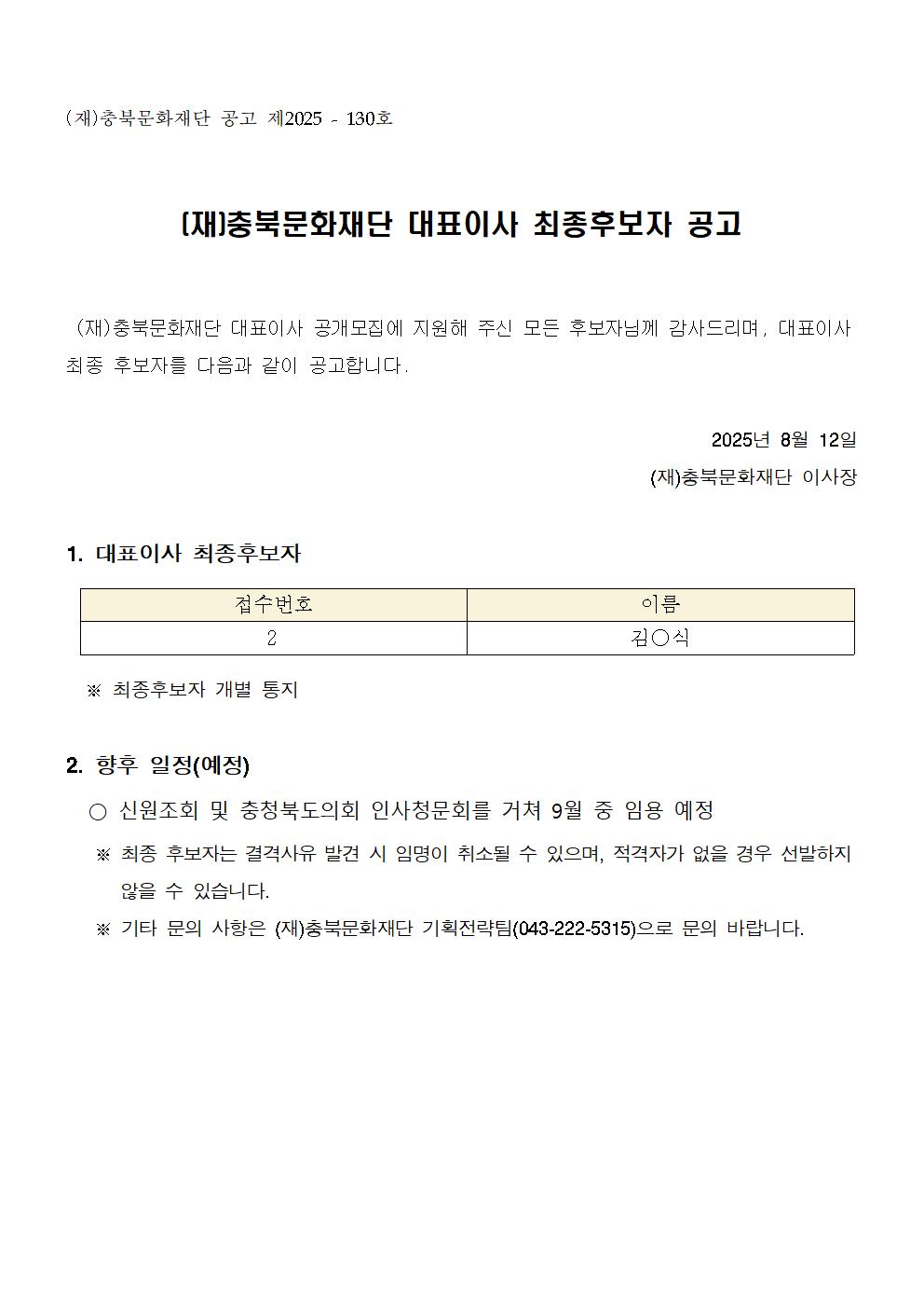 | (재)충북문화재단 대표이사 최종후보자 공고 | |||||
