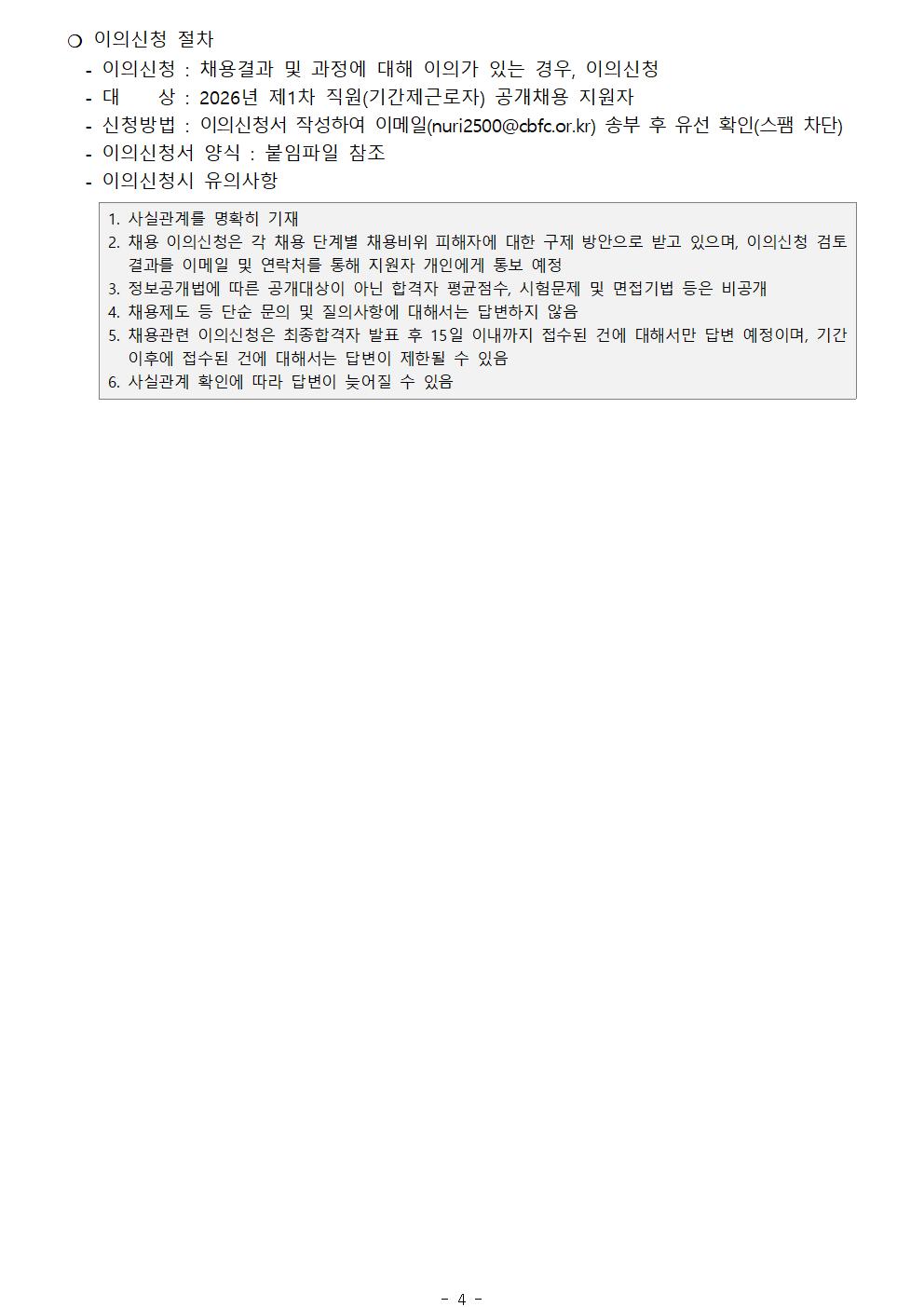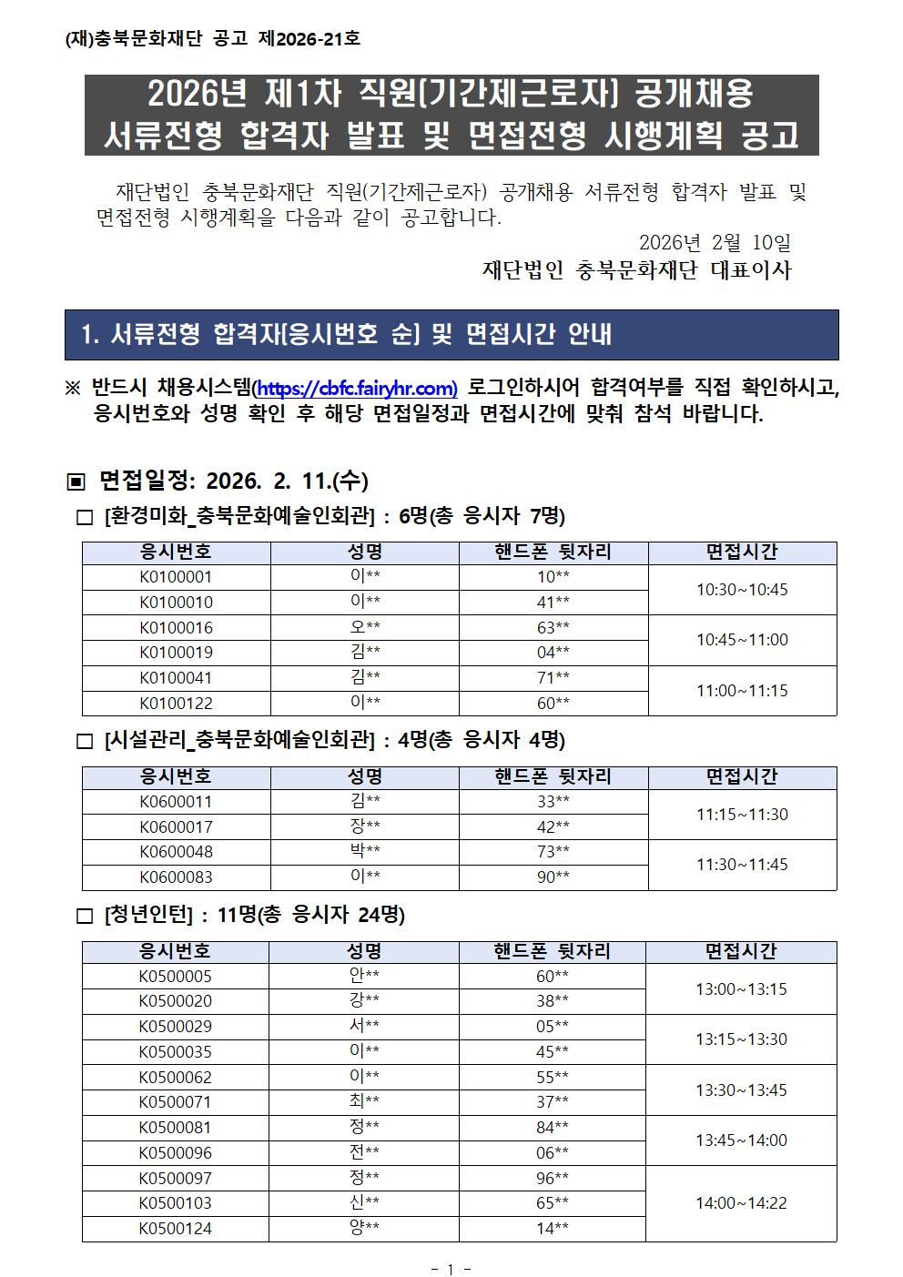 | 2026년 제1차 충북문화재단 직원(기간제근로자) 공개채용 서류전형 합격자 발표 및 면접전형 시행계획 공고 | |||||