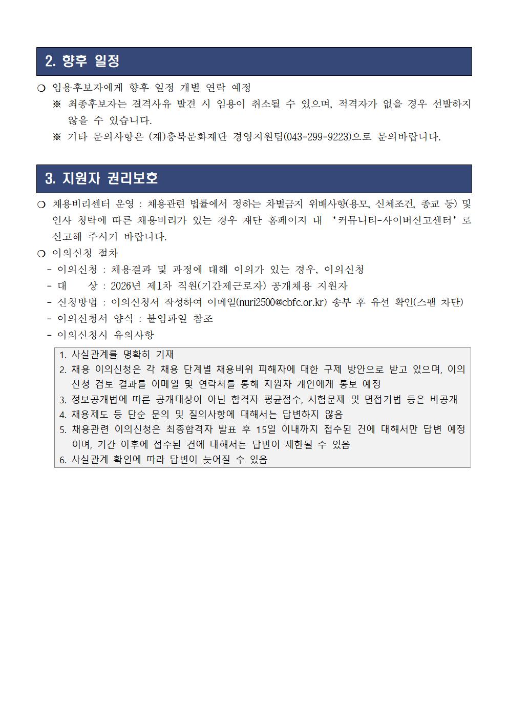 | 다음글 | 2026년 (재)충북문화재단 제2차 직원(기간제근로자) 공개채용 공고 |