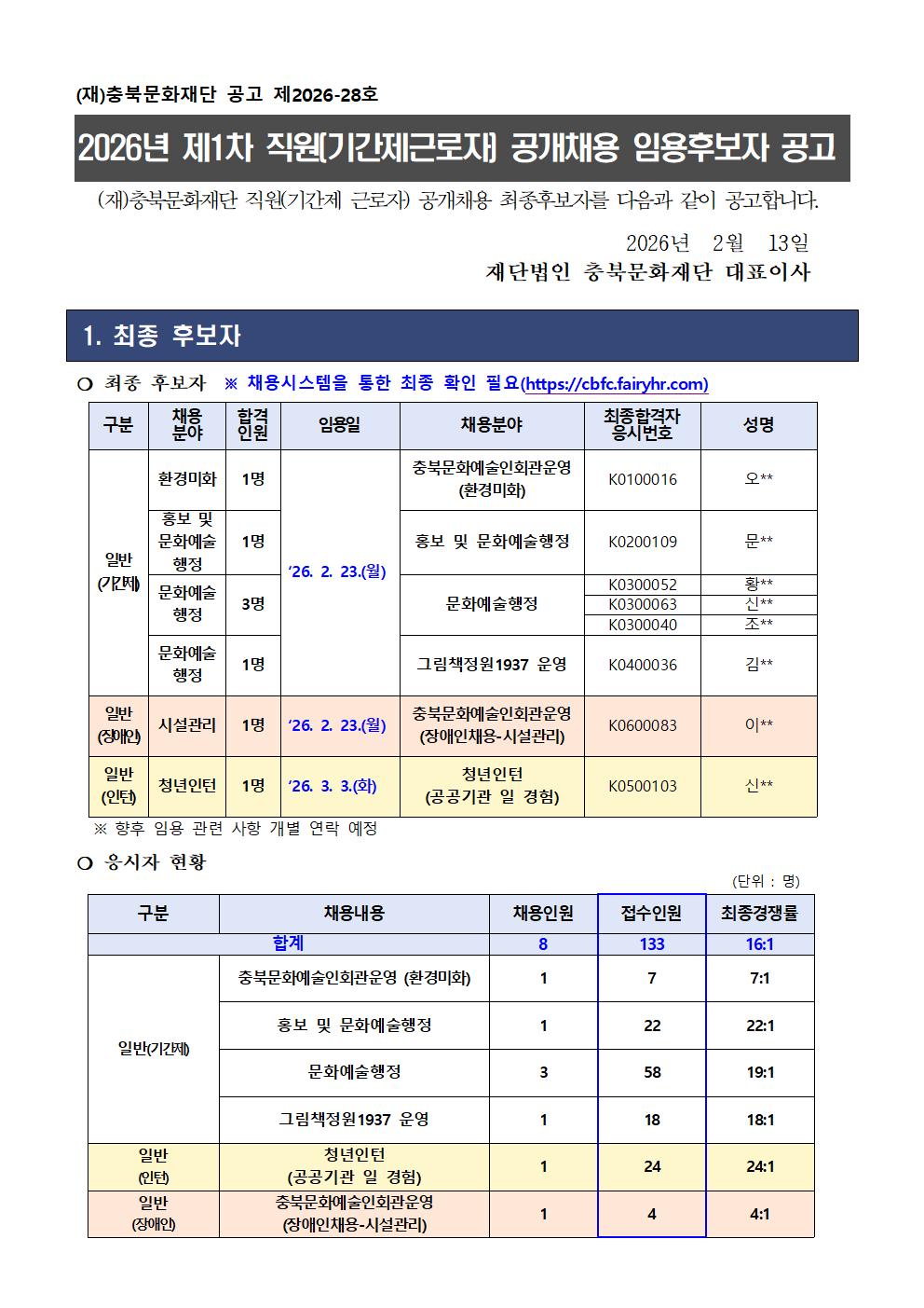 | 2026년 제1차 직원(기간제근로자) 공개채용 임용후보자 공고 | |||||