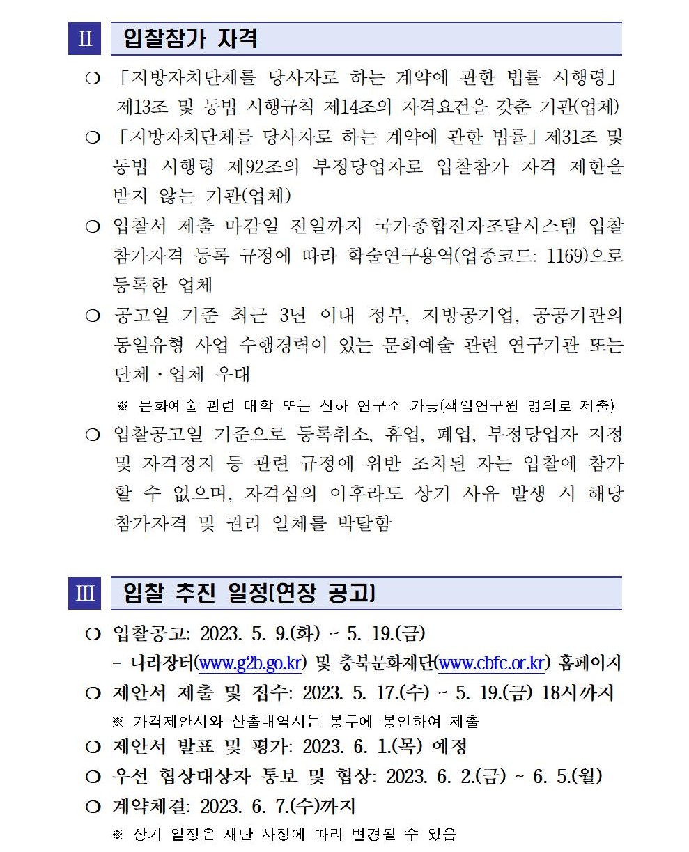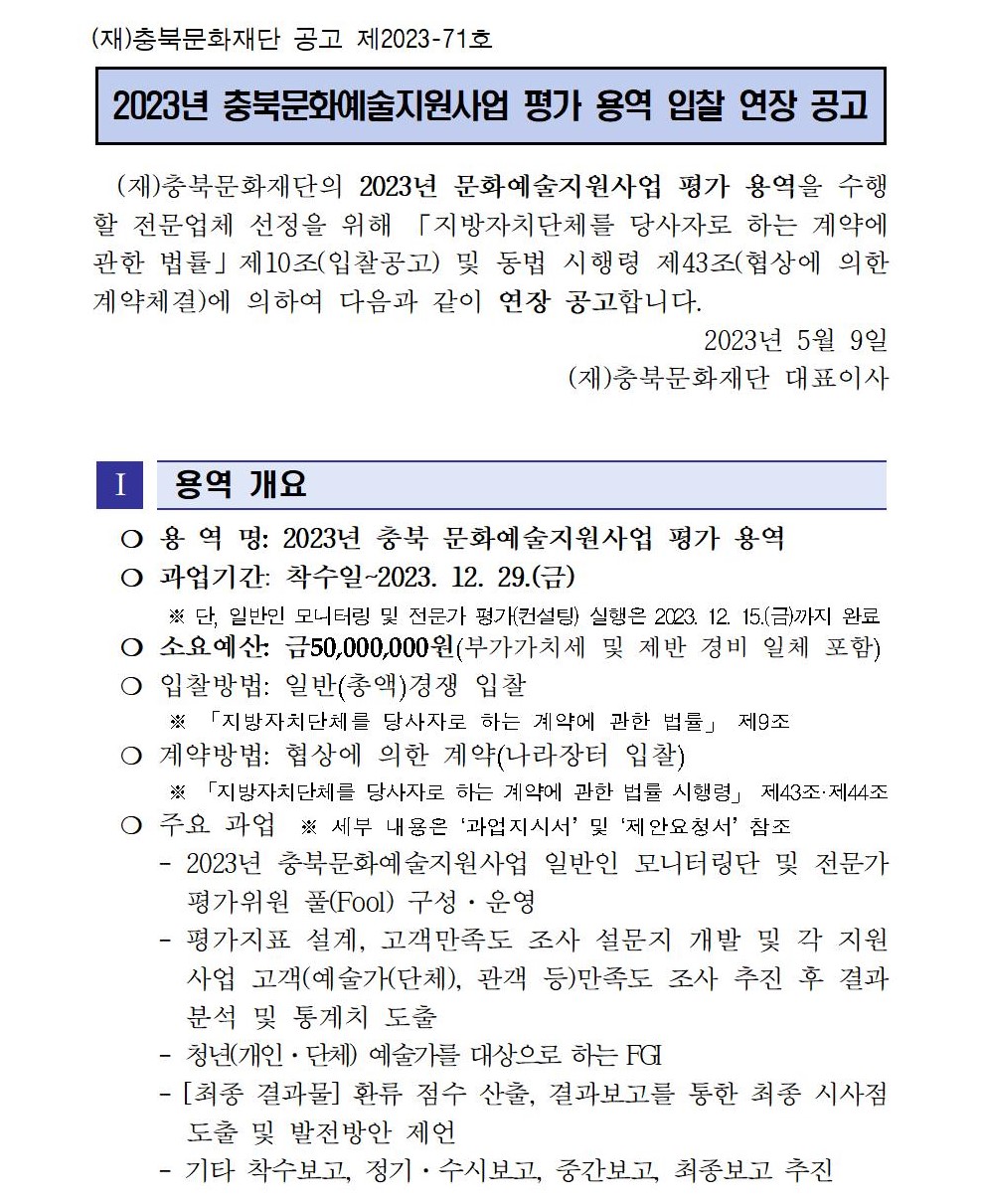 | 2023년 충북 문화예술지원사업 평가 용역 입찰 연장 공고 | |||||
