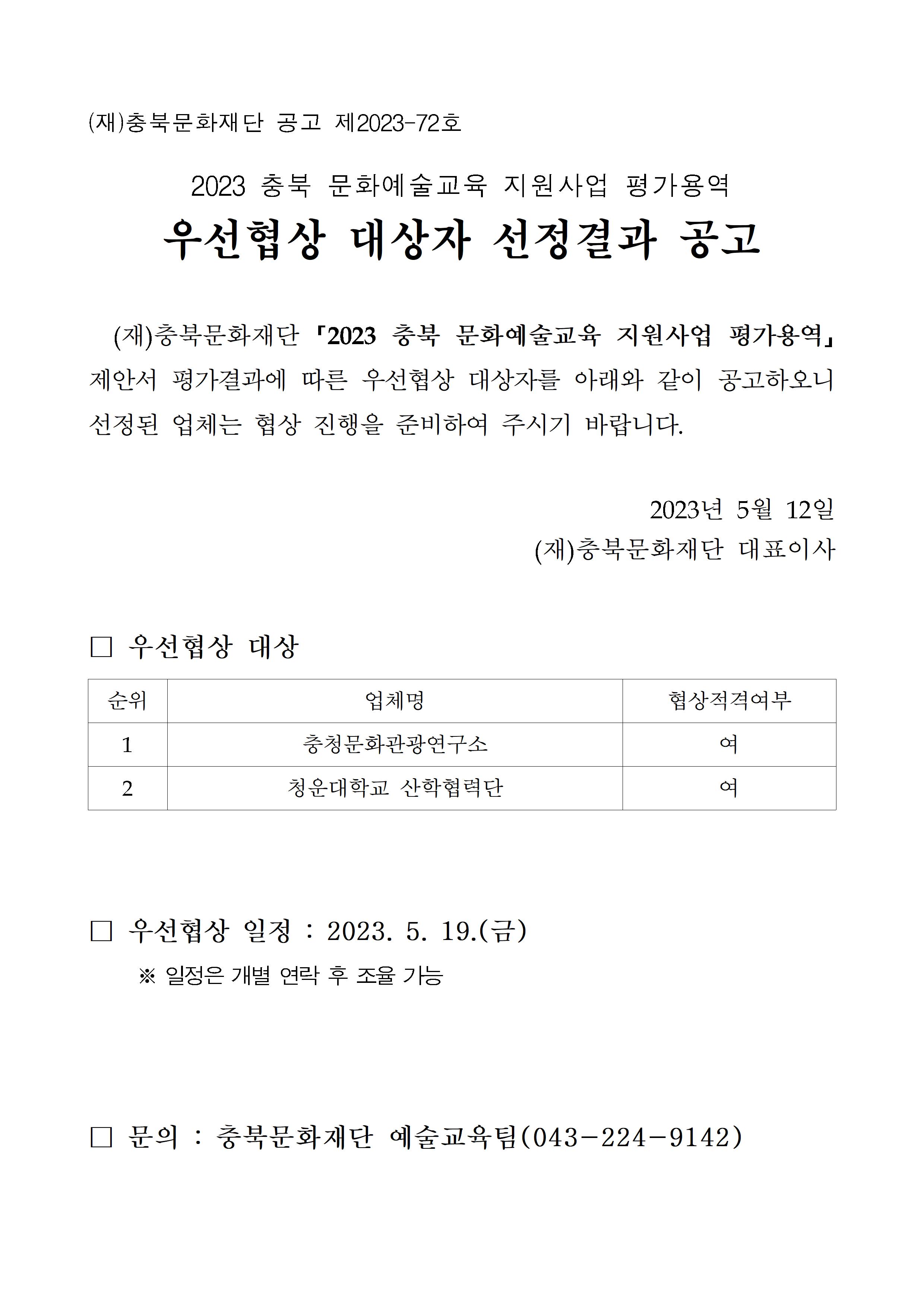| 2023 충북 문화예술교육 지원사업 평가용역 우선협상 대상자 선정결과 공고 | |||||