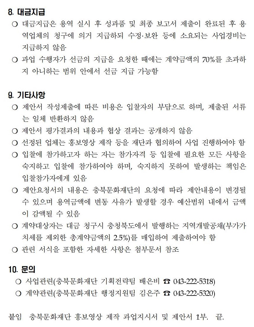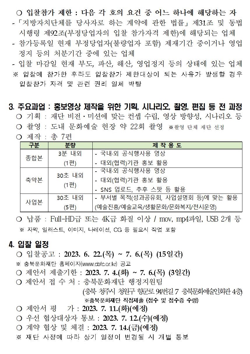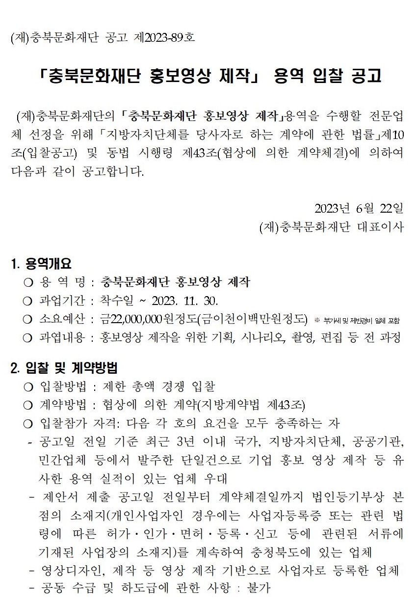 | 「충북문화재단 홍보영상 제작」 용역 입찰 공고 | |||||
